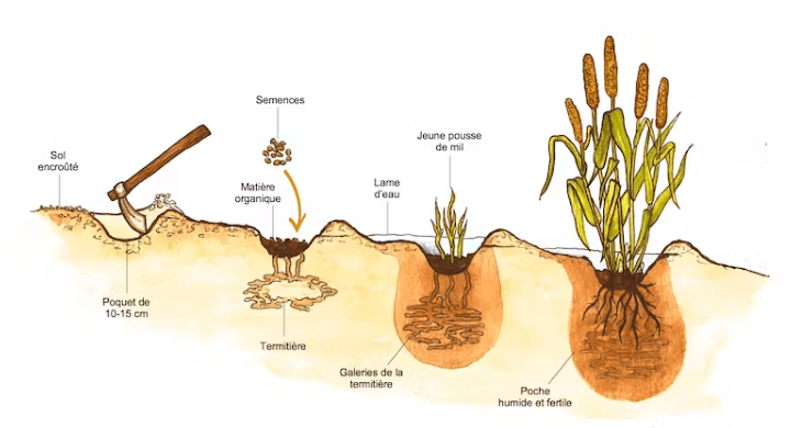 Говорите, просто дыра? За кажущейся простотой заи на самом деле кроются сложные экологические механизмы. Этот метод заключается в концентрировании воды и навоза для стимулирования роста сельскохозяйственных культур в условиях, когда дожди столь же редки, сколь и случайны. Для этого в засушливый период готовят карманы, то есть лунки глубиной 10-15 см и диаметром 20-40 см для внесения органических удобрений и посева злаков (просо или сорго).