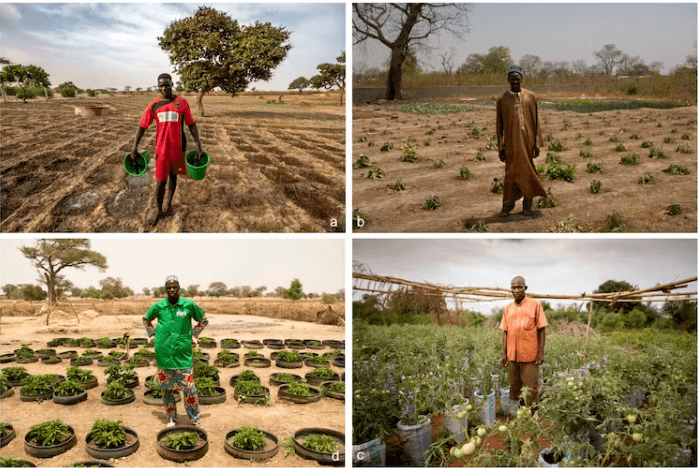 а) в Мборо (департамент Меуан, Сенегал) Моду Фолл сделал на своем луковом участке небольшие углубления для концентрации навоза и воды на корневом уровне; (b) В Медине Йоро Фула (департамент Колда, Сенегал) этот производитель пересадил свои баклажаны в карманы, заполненные органическим веществом. Полив ограничивается заполнением этих карманов, что позволяет значительно сэкономить воду; с) на ферралитовых плато Кпомассе (Бенин) вода является редким и ценным ресурсом. Франсуа сажает помидоры в холщовые мешки, чтобы экономить воду и предотвращать теллурические заболевания; d) в Нгулул-Серере (департамент Фатик, Сенегал) Диатта Диуф использует переработанные шины для концентрации навоза и воды на корневом уровне своих перцев. Рафаэль Бельмин/CIRAD