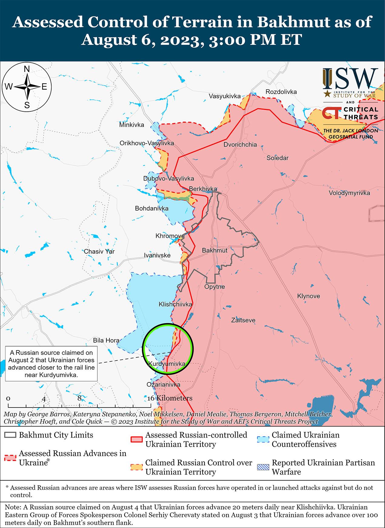 6 августа украинские силы продолжили контрнаступательные действия как минимум на двух участках фронта. В украинском Генштабе сообщили, что украинские силы вели наступательные действия на Бердянском (запад Донецко-восточной части Запорожской области) и Мелитопольском (запад Запорожской области) направлениях. [14] Министерство обороны России и другие российские источники утверждали, что российские войска отразили украинские наступательные действия под Бахмутом. [15] Начальник Главного управления военной разведки (ГУР) Украины генерал-майор Кирилл Буданов заявил в интервью, опубликованном 5 августа, что украинские войска продвигаются в районе Бахмута быстрее, чем на юге Украины. [16] Буданов также заявил, что российские войска построили стационарные, полностью оборудованные, забетонированные оборонительные посты на юге Украины, что затрудняет украинское наступление там. [17]