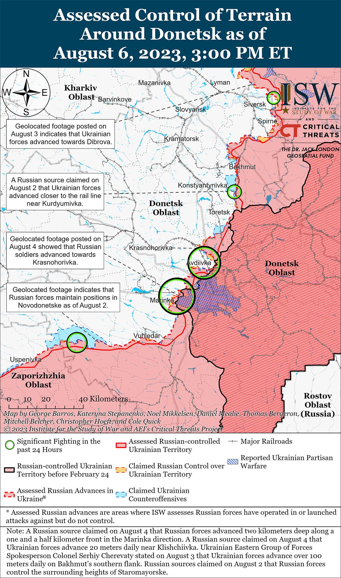 Министерство обороны России заявило, что украинские силы провели ограниченные наземные атаки вдоль линии Авдеевка-Донецк и не продвинулись 6 августа. Минобороны России заявило, что подразделения Южной группировки войск отразили украинские атаки вблизи Первомайского (11 км к юго-западу от Авдеевки), Невельского (13 км к юго-западу от Авдеевки) и Марьинки (на западной окраине Донецка). [43]