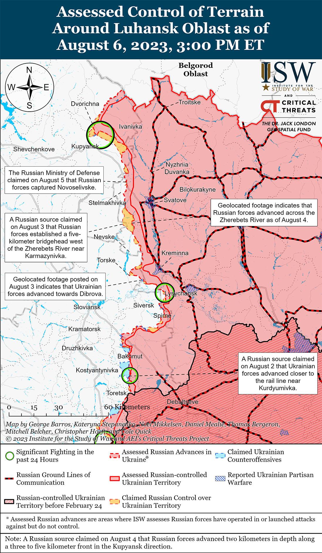 6 августа российские войска провели наступательные действия вдоль линии Купянск-Сватово-Кременная и, как сообщается, продвинулись вперед. Генеральный штаб Украины сообщил, что российские войска безуспешно атаковали украинские силы в районе Петропавловки (7 км к востоку от Купянска), Ольшаны, Синьковки и Белогоровки (12 км к югу от Кременной). [32] Официальный представитель Западной группировки войск России Сергей Зыбинский заявил, что российские штурмовые группы 6-й общевойсковой армии (Западный военный округ) продвинулись в украинскую оборону под Ольшаной. [33] Некоторые российские блогеры утверждали, что 5 августа российские войска взяли под контроль Новоселовское. [34] Связанный с Кремлем военный блогер заявил, что российские войска «решительно» захватили Новоселовское после нескольких месяцев боев и 5 августа вытеснили украинские силы с последних позиций в западной части населенного пункта. [35] Военный блогер утверждал, что продолжаются ожесточенные бои за высоты к югу от Новоселовского. [36] ISW пока не наблюдал визуального подтверждения этих утверждений.