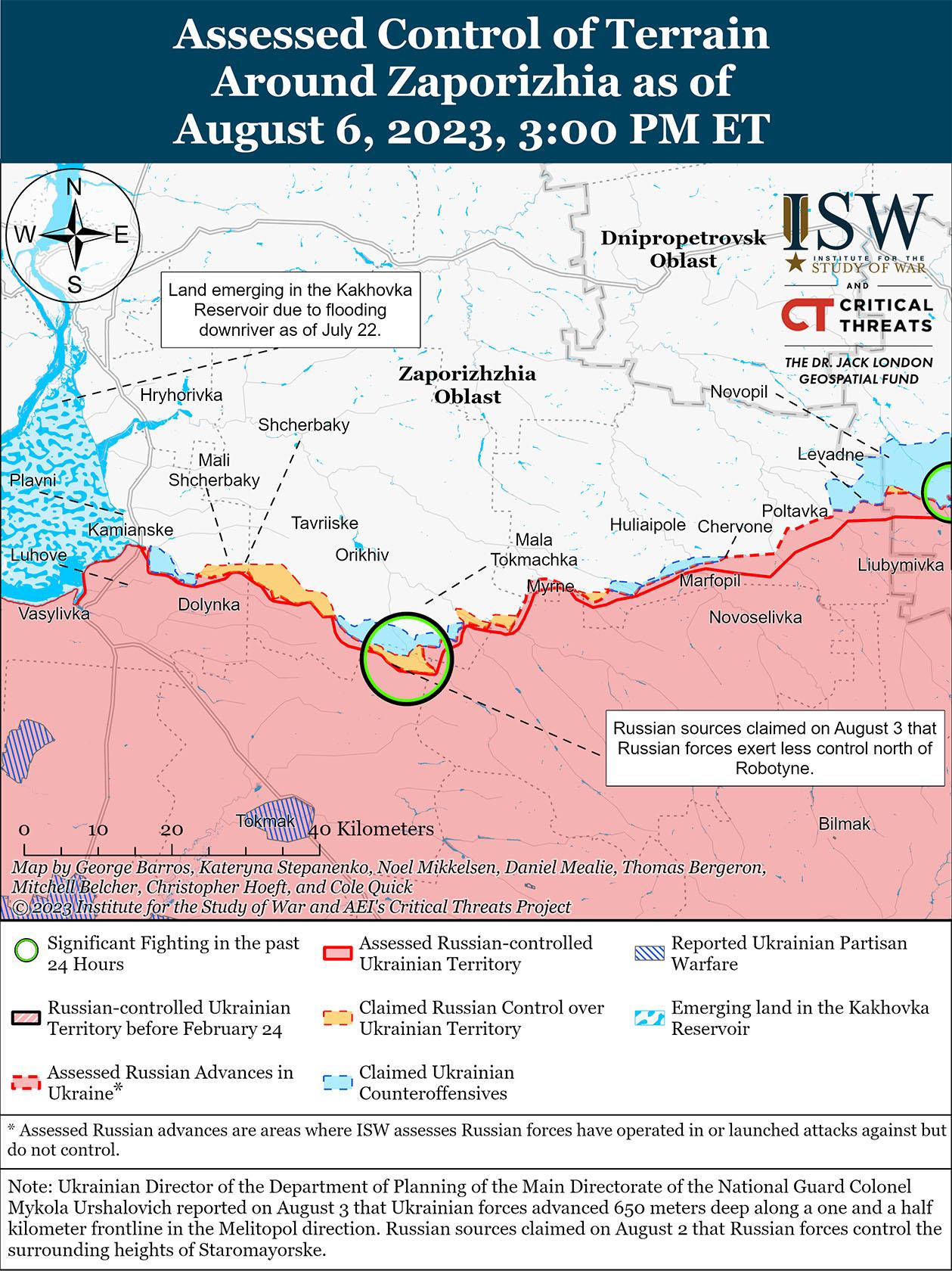 Украинские силы продолжали контрнаступательные операции на западе Запорожской области, но 6 августа не добились каких-либо подтвержденных успехов. Министерство обороны России (МО) и российские блогеры утверждали, что российские войска отразили украинские атаки возле Роботино (12 км к югу от Орехова). [51] Российские блогеры утверждали, что украинские военные проводили штурмы в этом районе небольшими бронегруппами. [52] Один российский блогер утверждал, что украинские войска достигли неустановленной позиции российских траншей вдоль линии Роботино-Вербовое (до 18 км к юго-востоку от Орехова) и открыли там огонь из стрелкового оружия, но позже российские войска контратаковали и вытеснили украинские силы из окопов. [53] Глава оккупационной администрации Запорожской области Евгений Балицкий заявил, что российские войска без поддержки техники отразили украинские пехотные группы, которые пытались продвинуться в районе Малой Токмачки (7 км к юго-востоку от Орехова) и Новопокровки (14 км к юго-востоку от Орехова). [54]