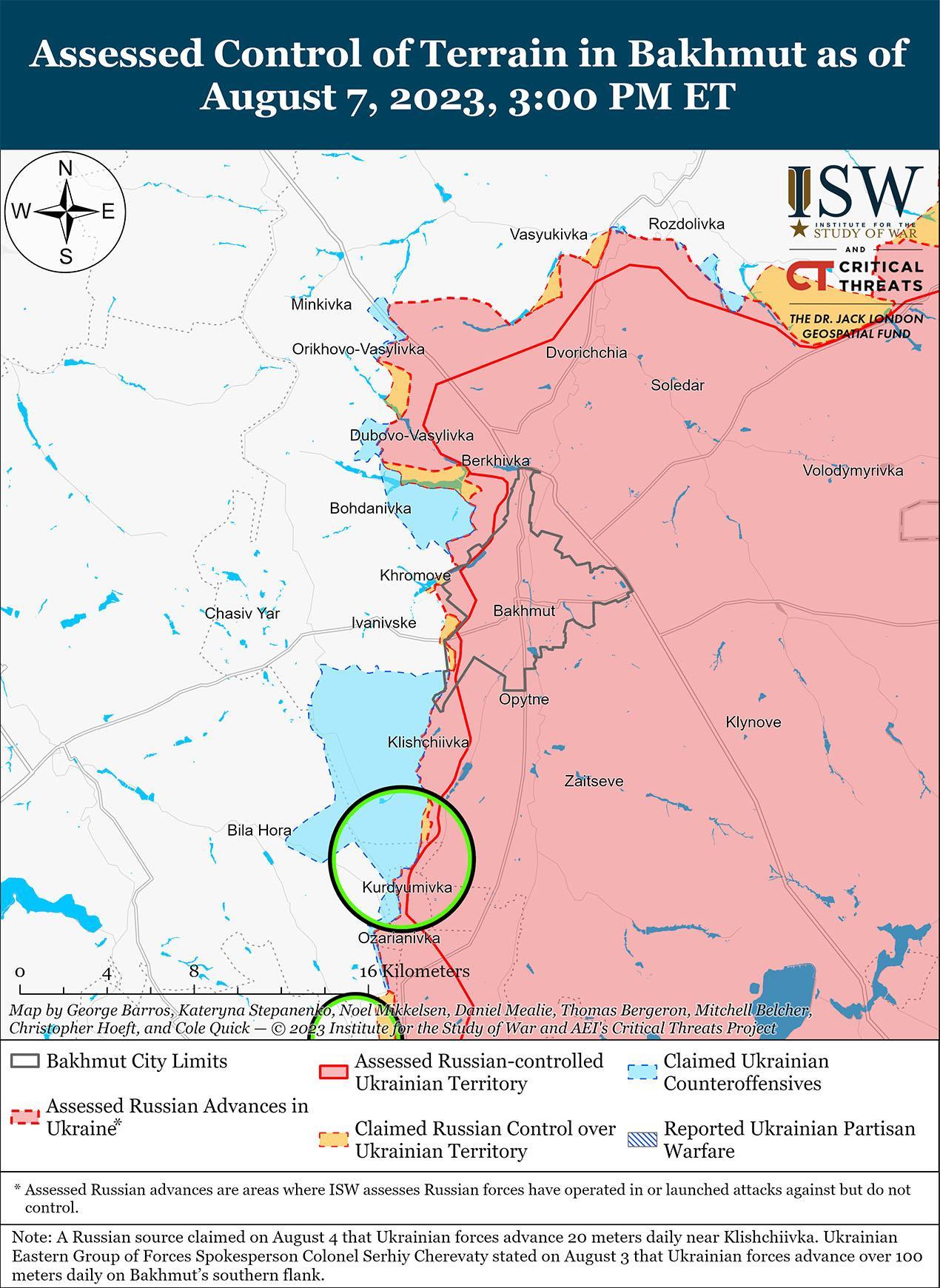 Украинские силы вели наступательные действия в районе Бахмута, но 7 августа не продвинулись вперед. Российский блогер заявил, что украинские силы провели ограниченные наземные атаки в районе между Ягодным (2 км к северу от Бахмута) и Берховкой (6 км к северо-западу от Бахмута), где продолжаются бои. [28] Многочисленные российские источники утверждали, что украинская пехота безуспешно атаковала российские войска со стороны Берховского водохранилища на северном фланге Бахмута. [29] Многочисленные российские источники также утверждали, что небольшие украинские пехотные группы безуспешно атаковали российские войска возле Клещеевки (7 км к юго-западу от Бахмута). [30] Заместитель министра обороны Украины Анна Маляр сообщила, что бои продолжаются вблизи Клещеевки, Андреевки (10 км к юго-западу от Бахмута) и Курдюмовки (13 км к юго-западу от Бахмута). [31]