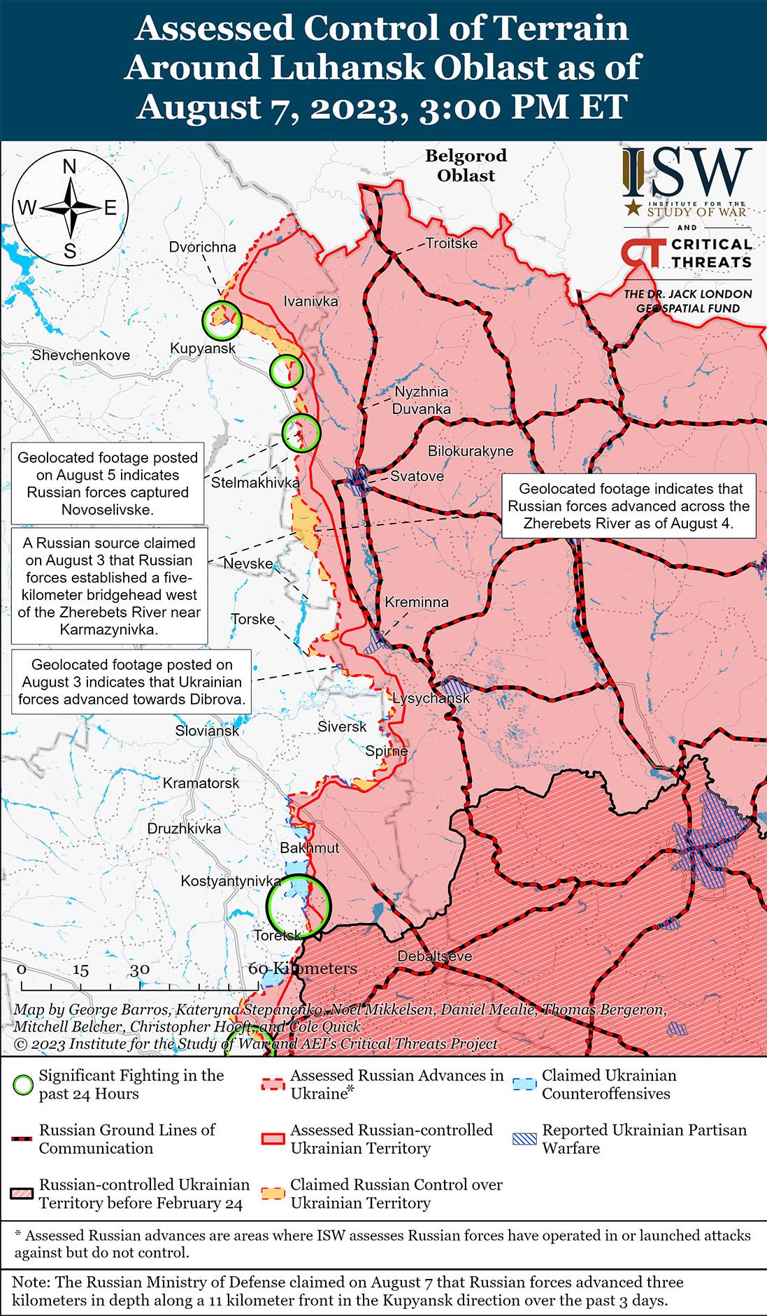 7 августа враг вел наступательные действия на линии Купянск — Сватово — Кременная и продвинулся вперед. На геолокационных кадрах, опубликованных 5 августа, видно, что российские войска захватили Новоселовское. [22] Минобороны России заявило, что российские войска продвинулись в украинскую оборону возле Ольшаны (15 км к северо-востоку от Купянска) и что за последние три дня российские войска продвинулись на 11 километров по фронту и на три километра вглубь на Купянском направлении. [23] Российский блогер заявил, что российские войска захватили украинские позиции возле Кармазиновки (13 км к юго-западу от Сватово). [24] Украинские официальные лица сообщили, что украинские силы отразили российские атаки вблизи Синьковки, к востоку от Петропавловки (7 км к востоку от Купянска), к северу от Ивановки (30 км к северо-западу от Сватово), к югу от Новоселовского, возле Новоегоровки (16 км к юго-западу от Сватово), Сергеевки (12 км к юго-западу от Сватово) и возле Надежды (13 км к юго-западу от Сватово). [25]