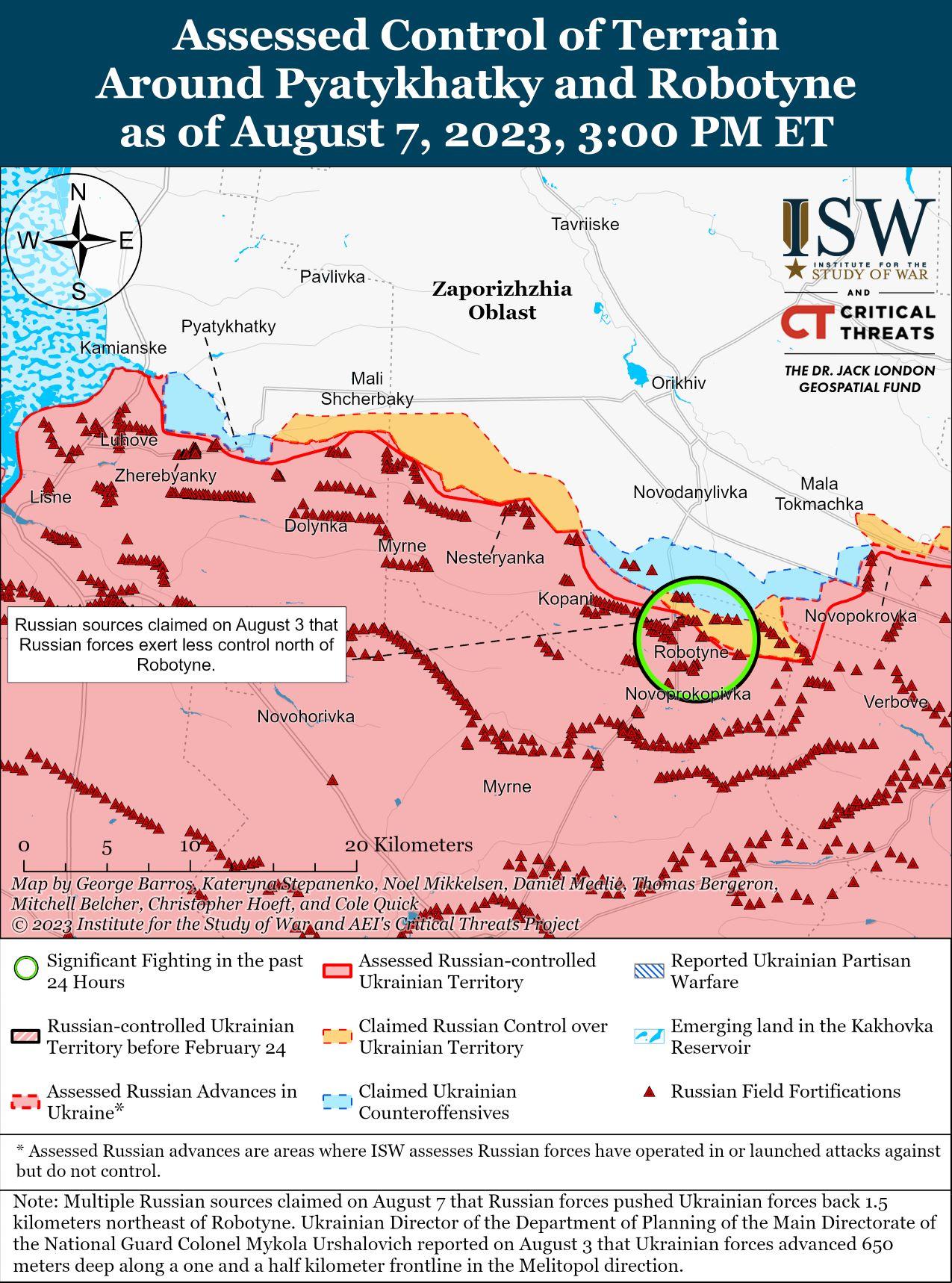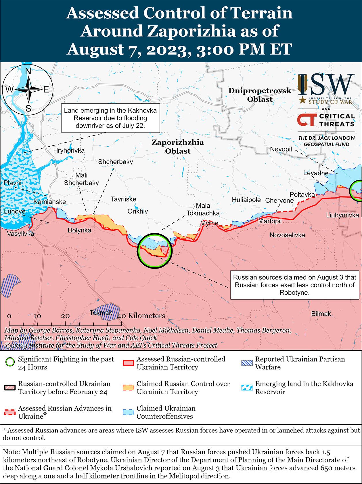 7 августа украинские силы продолжили наступательные действия на западе Запорожской области и не добились каких-либо заявленных или подтвержденных успехов. Маляр отметила, что украинские силы продолжают успешные наступательные действия на Мелитопольском (запад Запорожской области) направлении и закрепляют позиции вблизи Малой Токмачки (10 км к юго-востоку от Орехова) и Роботино (15 км к югу от Орехова). [41] Российские военные блогеры утверждали, что украинские войска предприняли ограниченную атаку механизированной пехотой и танковой поддержкой в направлении Роботино, но российские войска отразили атаку. [42] Российское новостное издание «РИА Новости» заявило, что российские войска продолжают отражать украинские атаки в направлении Роботино и не дают украинским силам продвинуться дальше окраин населенного пункта. [43] Один из блогеров отметил, что активность Украины на этом участке фронта относительно низкая, и заявил, что небольшая диверсионно-разведывательная группа предприняла неудачную вылазку в направлении Пятихатки (25 км к юго-западу от Орехова). [44]