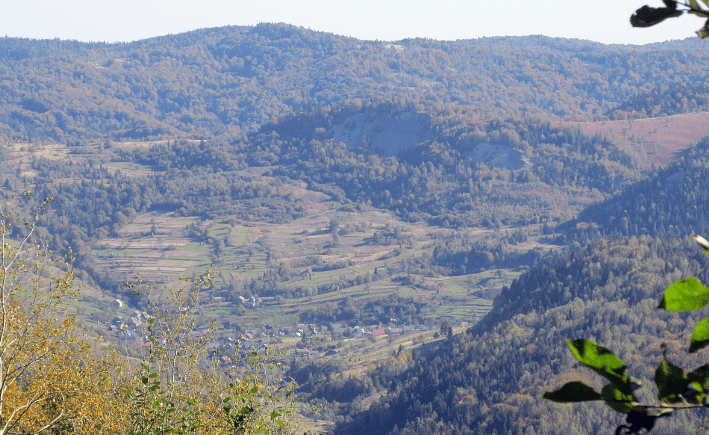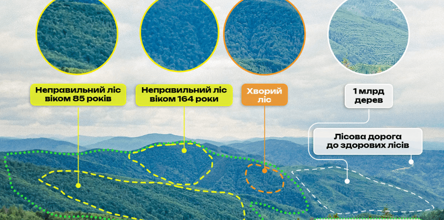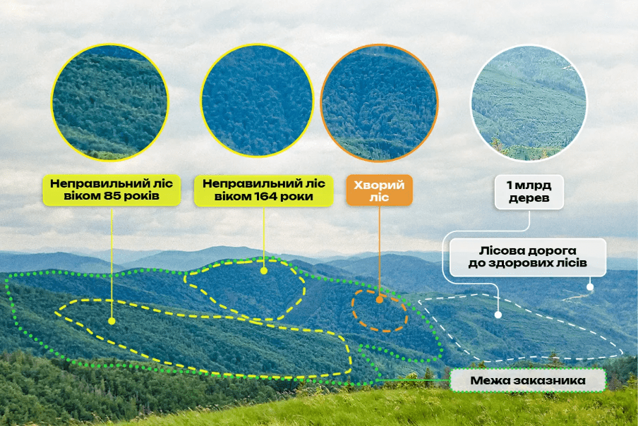 На малюнку − краєвид з гори Беньки на ліси філії «Сколівське лісове господарство» ДП «Ліси України». Справа по центру – ділянка суцільних рубок минулих років (обведена білим маркером). Старий ліс тут вирубали, а молоді деревця зарахували в «екологічну» програму «Мільярд дерев». Вирубка старого лісу стала можливою завдяки будівництву лісової дороги – яку видно на задньому плані.