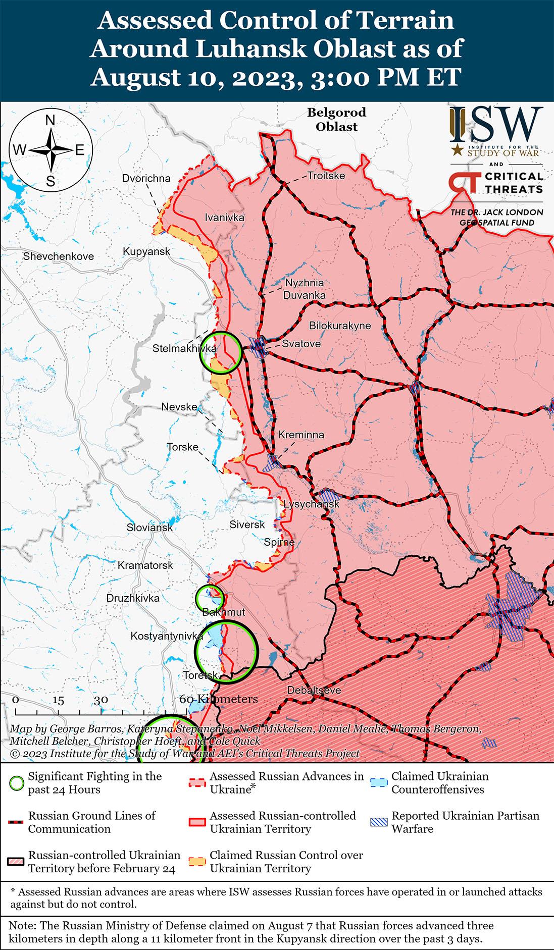 Российские войска продолжали наступательные операции к северо-востоку от Купянска и, как сообщается, 10 августа продвинулись вперед. Украинский Генеральный штаб сообщил, что украинские силы отразили атаки российских войск севернее Синьковки (8 км к северо-востоку от Купянска) и вблизи Ивановки (20 км к юго-востоку от Купянска)[35]. Пресс-секретарь Восточной группы войск Украины полковник Сергей Череватый заявил, что российские войска пытаются перехватить инициативу на купянском направлении и что украинские войска в последние дни значительно усилили оборону в этом районе[36]. В МО РФ утверждали, что штурмовые отряды Западной группировки войск улучшили свое тактическое положение на переднем крае в ходе наступательных действий на купянском направлении[37]. Представитель Западной группировки войск РФ Сергей Зыбинский заявил, что российские части 6-й общевойсковой армии (Западный военный округ) захватили пять опорных пунктов украинских войск в районе Ольшана (14 км к северо-востоку от Купянска)[38]. Российские военные блогеры утверждали, что российские войска перехватили инициативу на купянском направлении и ведут наступательные операции в районе Синьковка, Олльшана, Лиман Первый (11 км к северо-востоку от Купянска)[39]. Российский военный блогер заявил, что российские войска выдвинулись на позиции в 7 км от Купянска в районе Синьковки, а также продвигаются в направлении Каменка (33 км к северо-востоку от Купянска) и Двуречная (16 км к северо-востоку от Купянска)[40]. Другие российские блогеры утверждали, что украинские силы отошли с неустановленных позиций в районе Синьковки и что российские войска продвигаются после того, как украинские силы отступили в сторону Купянска.[41] Другой российский военный блогер утверждал, что российские войска продвинулись в сторону Масютовки (13 км к северо-востоку от Купянска) в период с 8 по 9 августа и что они занимают позиции в пределах 4 км от трассы Р-79 (Купянск — Двуречная)[42]. Военный блогер предположил, что российские силы пытаются захватить позиции вдоль линии Синьковка-Петропавловка-Кучеровка (до 7 км к востоку от Купянска) и планируют перекрыть украинские наземные линии коммуникаций (НЛК) вдоль трассы Р-79, чтобы угрожать украинским силам в Купянске.[43] ISW еще не зафиксировала визуальных свидетельств того, что российские силы совершают эти недавние наступления в направлении Купянска, и в настоящее время оценивает, что ближайшие российские позиции к Купянску находятся примерно в 10 км к северо-востоку от населенного пункта.