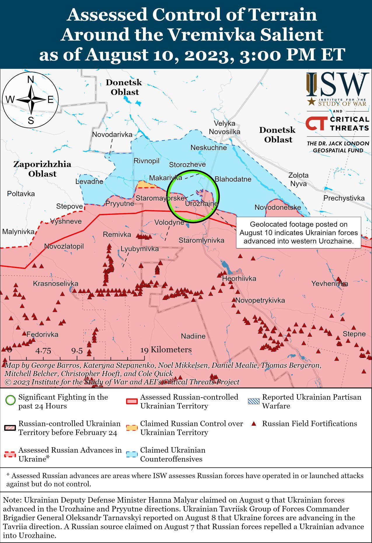 - Украинские силы продолжали контрнаступательные действия по меньшей мере на трех участках фронта и 10 августа продвинулись на западе границы Донецкой и восточной части Запорожской области.