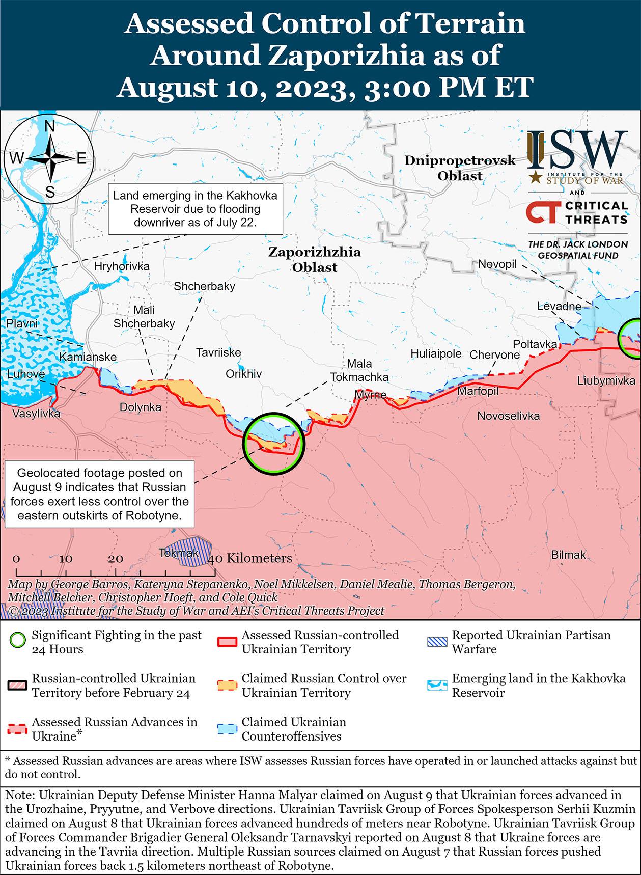 10 августа украинские силы провели наступательные операции на западе Запорожской области и, как сообщается, продвинулись вперед. В украинском Генштабе сообщили, что украинские силы продолжают наступательные действия в направлении Мелитополя (запад Запорожской области). [66] 9 августа российский блогер заявил, что украинские войска продвинулись к российской обороне вблизи Роботино (10 км к югу от Орехова) и Новопокровки (16 км к юго-востоку от Орехова). [67] Российский блогер утверждал, что украинские войска безуспешно атаковали возле Роботино в ночь на 9 августа, а другой российский блогер утверждал, что украинские силы провели ограниченные наземные атаки возле Роботино 10 августа. [68] Российские источники утверждали, что 10 августа украинские силы безуспешно атаковали в направлении Вербовое (18 км к юго-востоку от Орехова). [69] 9 августа российский медиа-агрегатор заявил, что позиционные бои продолжаются вблизи Пятихатки (25 км к юго-западу от Орехова) и Роботино, а 10 августа российский блогер заявил, что украинские войска пытались провести ограниченные наземные атаки вблизи Пятихаток и Жеребянок (26 км к юго-западу от Орехова). [70]