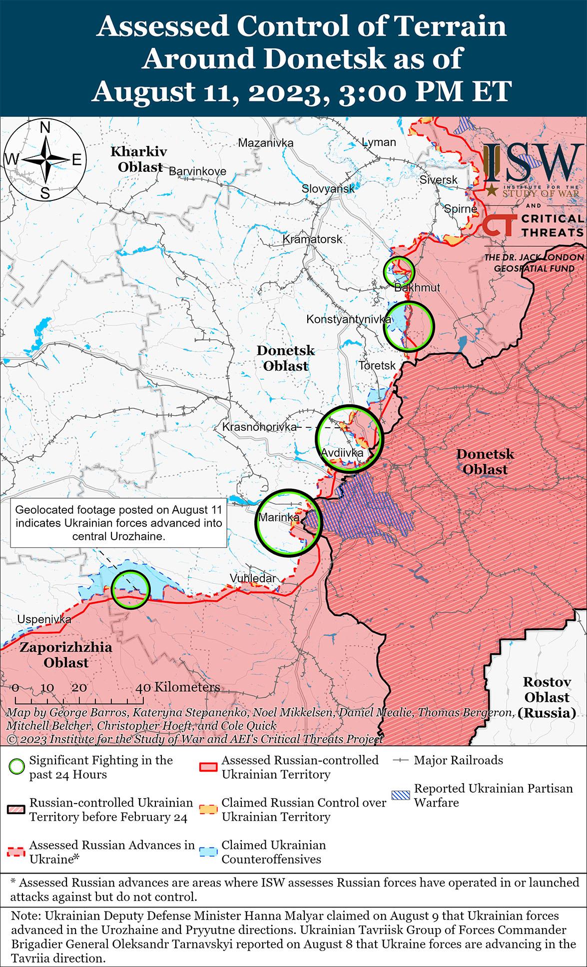 Министерство обороны России заявило, что украинские силы вели наступательные действия вдоль линии Авдеевка-Донецк, но 11 августа не продвинулись вперед. Минобороны России заявило, что украинские силы безуспешно атаковали вблизи Невельского (14 км к юго-западу от Авдеевки), Старомихайловки, Малиновки (24 км к северо-западу от Бахмута) и Веселого (5 км к северо-востоку от Авдеевки). [55]