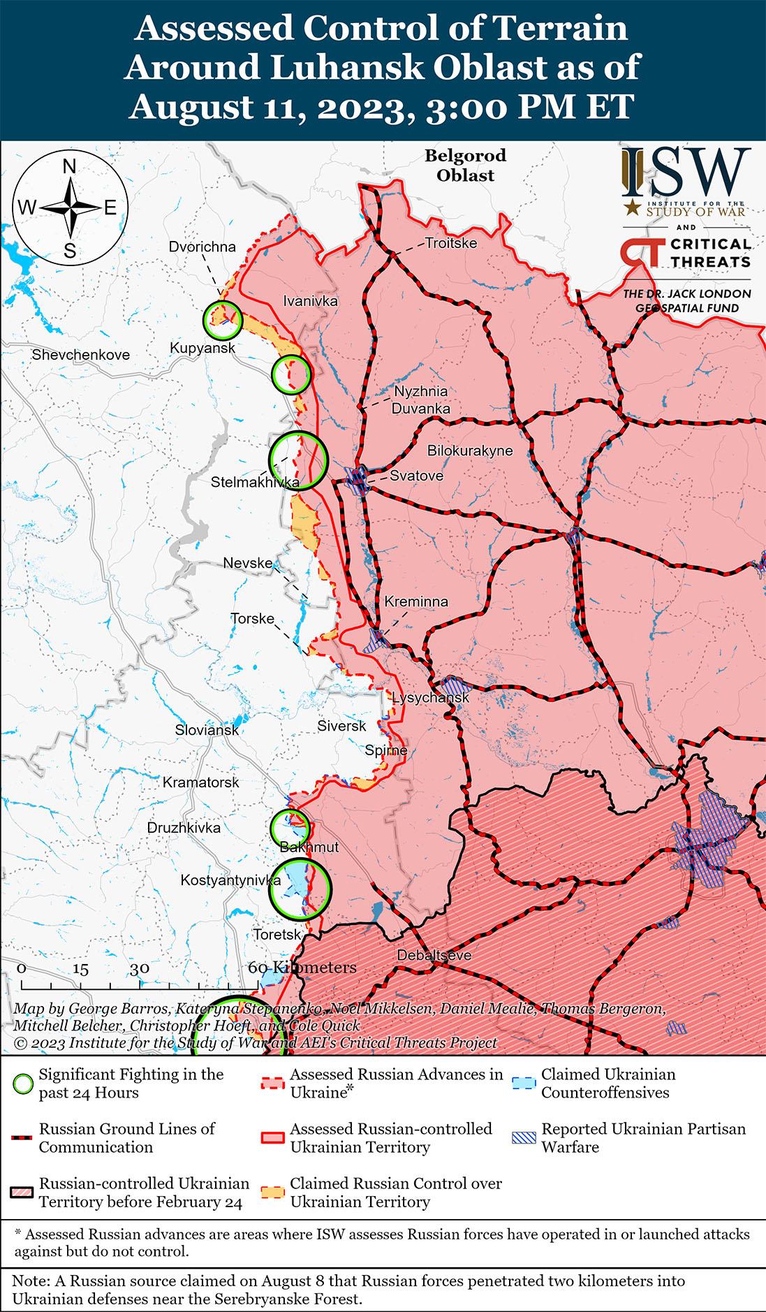 Российские войска, похоже, активизируют наступательные операции к северо-востоку от Купянска, что, вероятно, отвлечет украинские силы от более важных в оперативном отношении участков фронта. Известный связанный с Кремлем военный блогер заявил 10 августа, что российские наступления вдоль линии фронта в районе Купянска вынудили украинские силы бежать в Петропавловку (7 км к востоку от Купянска), и заявил, что российские войска угрожают разрушить украинскую оборону в этом районе. [19] Милблогер предсказал, что российские войска возьмут Петропавловку в ближайшие два дня и продолжат продвижение в сторону Купянска. [20] 11 августа военный блогер заявил, что российские войска недавно захватили 30 украинских «опорных пунктов» на Купянском направлении вдоль широкого фронта от Купянска до Кисловки (20 км к юго-востоку от Купянска). [21] 10 августа другой российский блогер заявил, что российские войска вошли на окраину Синьковки (9 км к северо-востоку от Купянска) и находятся менее чем в 10 км от передовых оборонительных рубежей Украины. [22] ISW не наблюдал визуального подтверждения российских заявлений о продвижении к северо-востоку от Купянска. Российские военные блогеры неоднократно заявляли об обширных российских проявлениях к юго-западу от Сватово, и ISW также не наблюдал визуального подтверждения этих утверждений, несмотря на то, что этим заявлениям уже несколько недель. [23] Российские войска, возможно, усилили наступательную активность на линии Купянск-Сватово-Кременная, чтобы воспользоваться оперативным сосредоточением Украины в других местах и отвлечь украинские подразделения от более важных участков фронта. Пресс-секретарь Восточной группы сил Украины полковник Сергей Череватый заявил, что украинские силы в последние дни значительно усилили оборону на Купянском направлении, что указывает на то, что российским силам, возможно, удалось привлечь в этот район дополнительные украинские силы. [24] Украинские официальные лица также объявили об обязательной эвакуации мирных жителей в 53 населенных пунктах вблизи Купянска 9 августа из-за усиления российских обстрелов и авиаударов, представляющих повышенный риск для гражданского населения, хотя эвакуация не обязательно указывает на то, что украинские силы ожидают значительных успехов российских войск. [25]