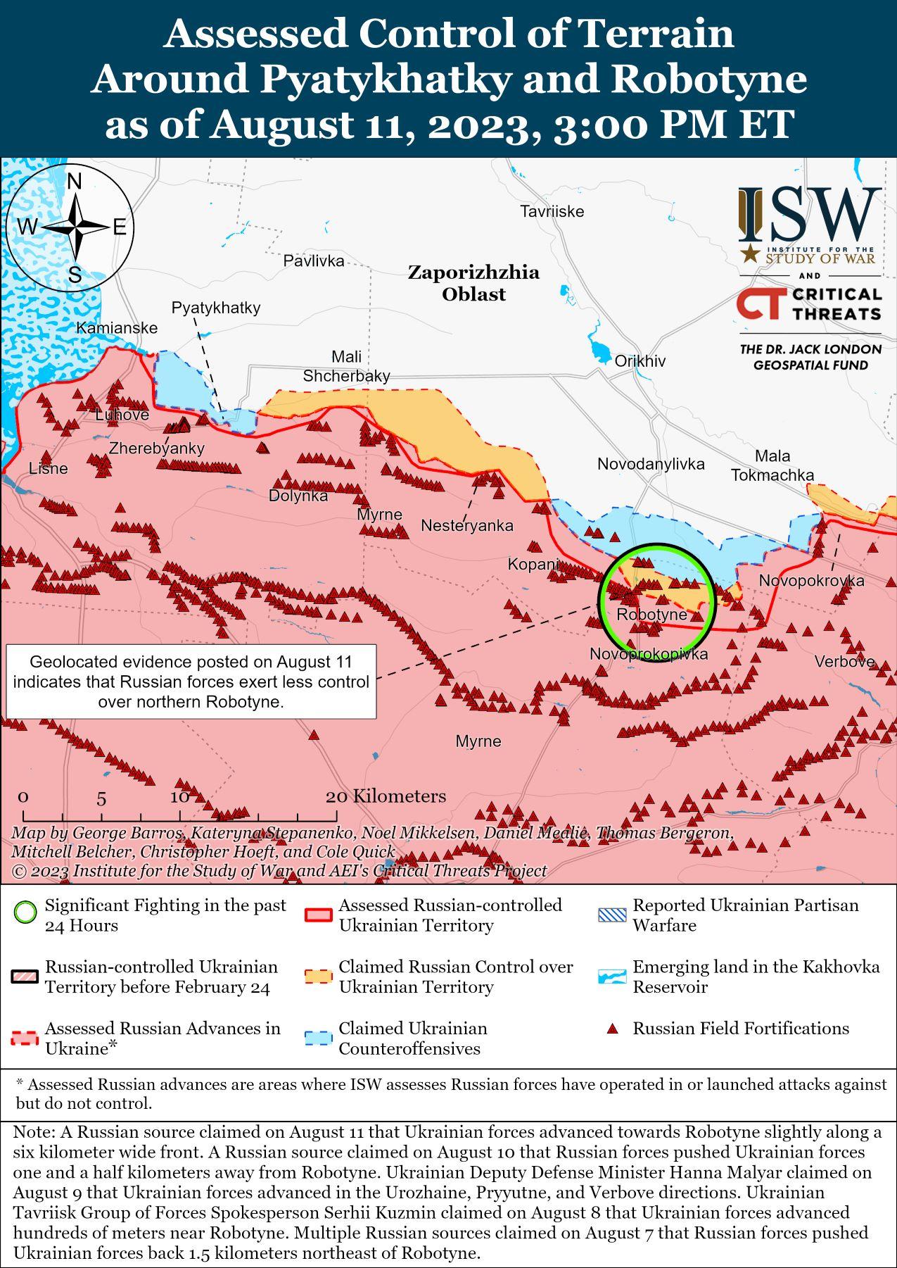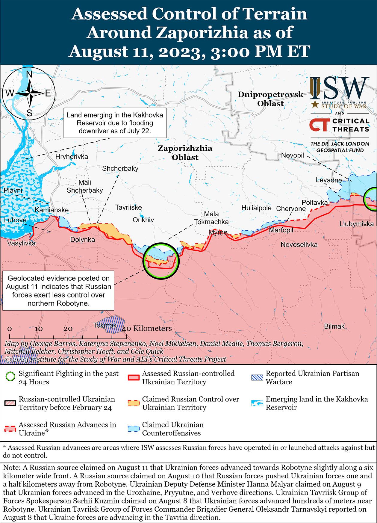 11 августа украинские силы продолжили наступательные действия и продвинулись до окраин Роботино (10 км к югу от Орехова) на западе Запорожской области. На геолокационных кадрах, опубликованных 11 августа, видно, что украинские войска достигли окраины Роботино, хотя масштабы и постоянство их позиций в этом районе остаются неясными. [69] Российский военный блогер заявил, что украинские силы расширили зону своего контроля вдоль фронта шириной шесть километров и немного в глубину возле Роботино. [70] Российские источники утверждали, что российские войска отразили украинские наземные атаки на линии Роботино-Вербовое (до 18 км к юго-востоку от Орехова). [71] Российский военный блогер утверждал, что российские войска оттеснили украинские силы на 1,5 километра возле Роботино, отражая украинскую атаку 10 августа. [72]