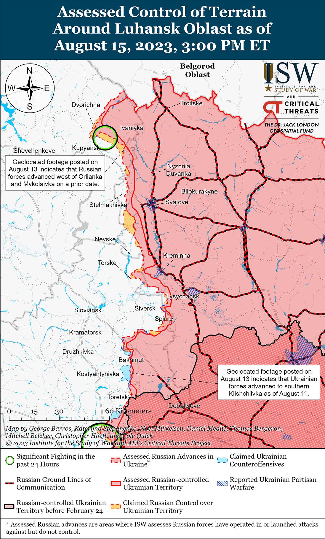 Украинские силы вели наступательные действия вдоль линии Купянск — Сватово — Кременная и, как сообщается, продвинулись вперед 15 августа. Министерство обороны России заявило, что украинские силы провели безуспешные наступательные действия вблизи Ольшаны (15 км к северо-востоку от Купянска), Синьковки (8 км к северо-востоку от Купянска), Новоселовского (14 км к северо-западу от Сватово), Новоегоровки (15 км к юго-западу от Сватово), Белогоровки (12 км к югу от Кременной), Раздоловки (31 км к юго-западу от Кременной), Кузьмино (3 км к юго-западу от Кременной) и Веселого (31 км к югу от Кременной). [37] Официальный представитель Западной группировки войск России Сергей Зыбинский заявил, что украинские силы безуспешно атаковали вблизи Синьковки, урочища Маньковка (примерно в 15 км к востоку от Купянска), «леса Уса» (вероятно, между Синьковкой и Лиманом Першим) и Новоселовского. [38] 14 августа официальный представитель Центральной группировки войск России Александр Савчук заявил, что украинские войска безуспешно атаковали на Сватовском направлении. [39] Российский блогер заявил, что 13 августа украинские силы безуспешно атаковали возле Сватово и безуспешно проводили небольшие атаки возле Кармазиновки (15 км к юго-западу от Сватово). [40] Другой российский блогер утверждал, что украинские войска безуспешно атаковали вблизи Торского (15 км к западу от Кременной) и Серебрянского лесничества (10 км к юго-западу от Кременной). [41] Координаты, опубликованные российским военным блогером, указывают на то, что украинские войска продвинулись к югу от Дибровой (7 км к юго-западу от Кременной). [42]