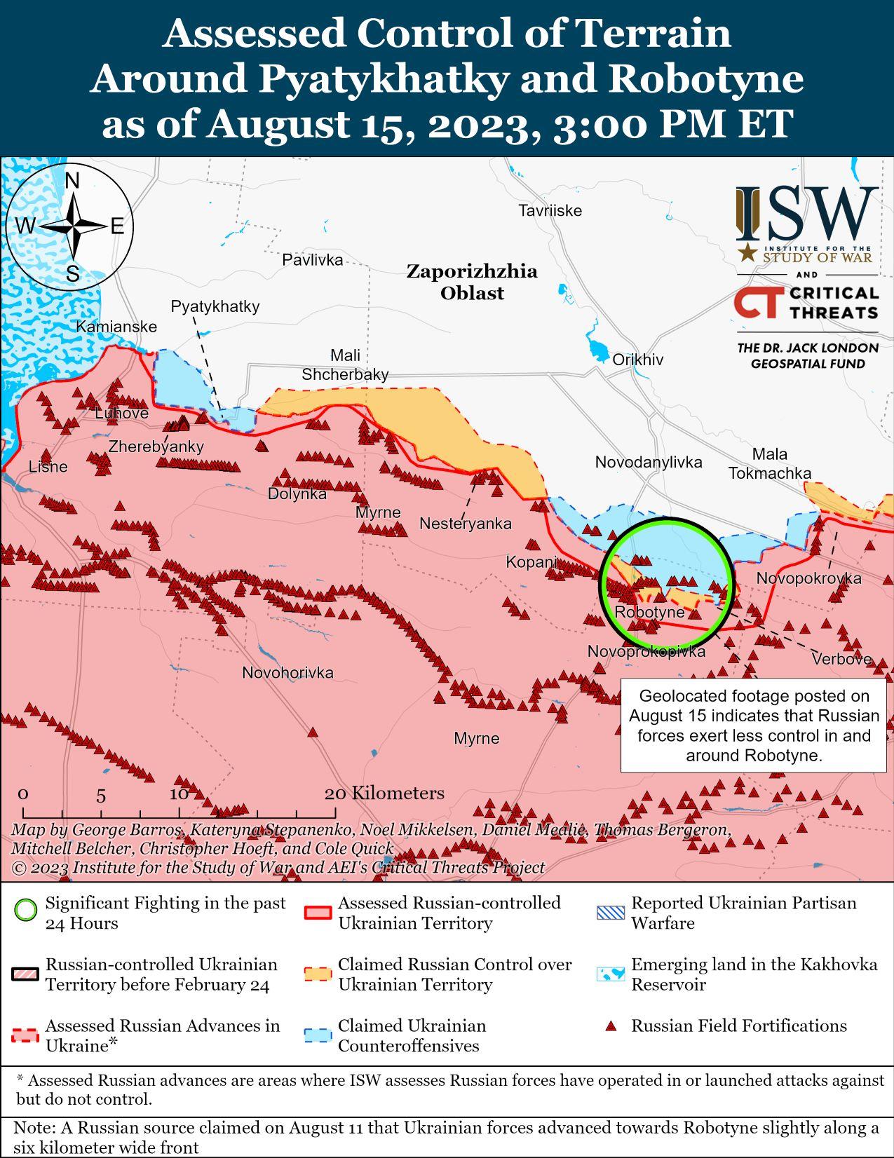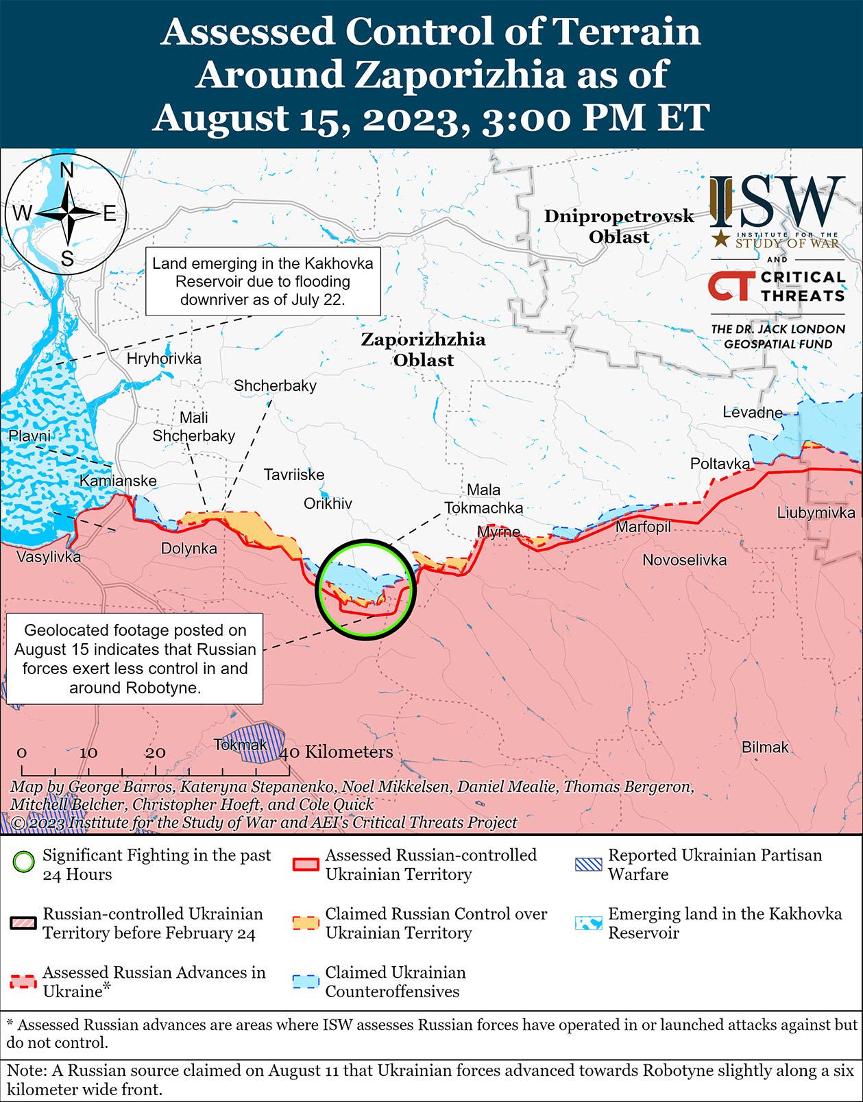 15 августа украинские войска продолжили наступление на западе Запорожской области. Сообщается, что на геолокационных кадрах, опубликованных 14 августа, видно, как российские войска нанесли удар по группе из пяти-семи украинских военнослужащих, укрывавшихся в здании в центре Роботино (15 км к югу от Орехова), что указывает на то, что украинские силы продвинулись в населенный пункт. [61] Российские источники, однако, утверждали, что на кадрах запечатлена неудавшаяся украинская атака на Роботино две недели назад, и подчеркивали, что российские войска отразили украинскую атаку. [62] Несмотря на то, что кадры сняты две недели назад, присутствие украинских войск в центре оккупированного Роботино говорит о том, что российский контроль над населенным пунктом, вероятно, незначителен и оспаривается. На геолокационных кадрах, опубликованных 15 августа, видно, как украинские силы используют предоставленную Западом технику к северу от Роботино, что подтверждает украинские и российские сообщения о том, что Украина, возможно, недавно развернула новые контрнаступательные бригады в западной части Запорожской области. [63] Российские источники также утверждали, что украинские силы предприняли неудачную атаку на Роботино в ночь с 14 на 15 августа, но российские войска отразили атаку. [64] Оккупационный глава Запорожской области Евгений Балицкий заявил, что украинские войска продолжают атаковать Роботино группами от 40 до 100 человек ежедневно. [65]