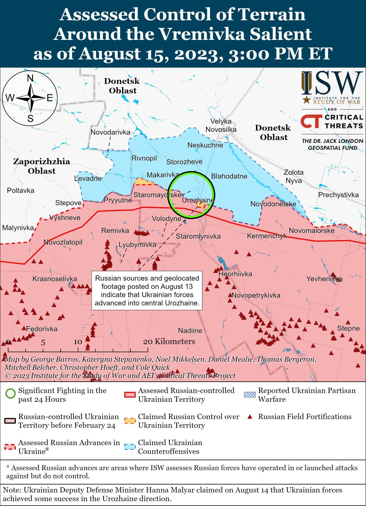 15 августа украинские войска продолжили наступательные действия в районе границы Донецкой и Запорожской областей. В украинском Генштабе сообщили, что украинские войска продолжают наступательные действия на Бердянском направлении (приграничный район Донецко-Запорожской области). [54] Российские военные блогеры утверждали, что украинские войска атакуют в Урожайное и его окрестностях (9 км к югу от Великой Новоселки), и большинство российских источников подчеркивали, что украинские войска удерживают позиции только на севере Урожайное, в то время как остальная часть населенного пункта остается оспариваемой «серой зоной», хотя, как ранее отмечал ISW, российские источники часто описывают удерживаемую Украиной территорию как «серую зону», чтобы свести к минимуму масштабы российских потерь. [55]