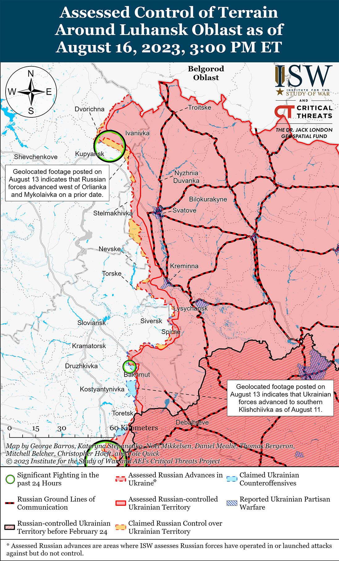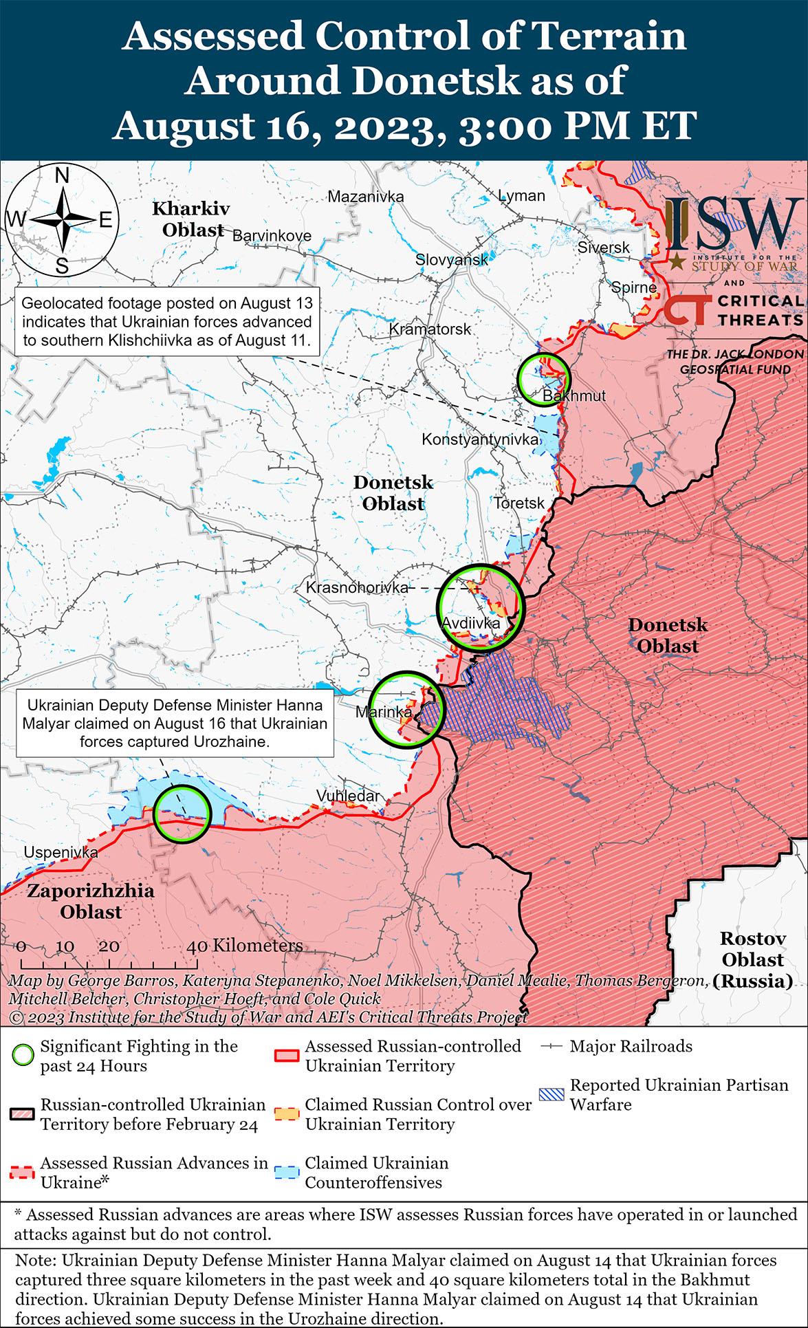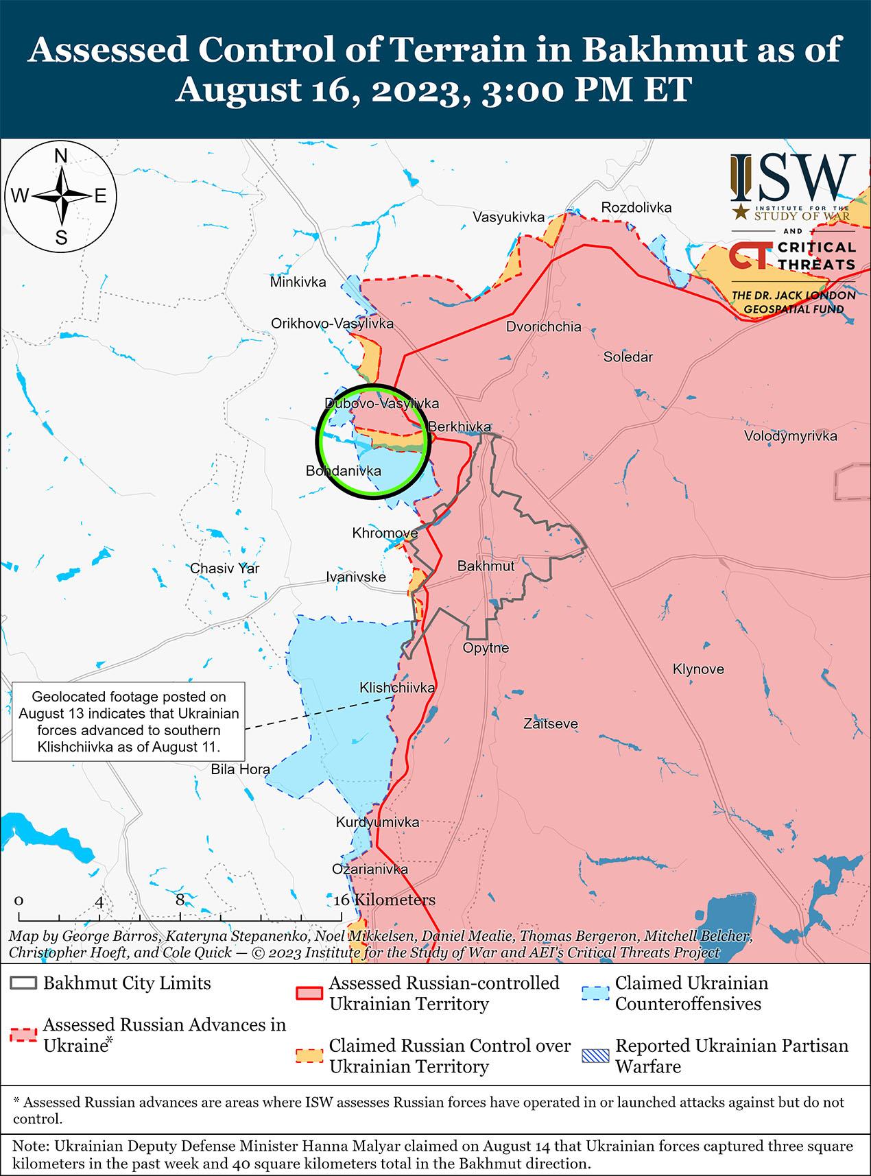 Российские войска продолжали наземные атаки в районе Бахмута 16 августа и, как сообщается, продвинулись вперед. Генштаб Украины сообщил, что российские войска вели безуспешные наступательные операции в районе Богдановка (8 км к северо-западу от Бахмута)[45]. 15 августа российский агрегатор новостей сообщил, что вечером 15 августа российские войска атаковали близ Веселого (20 км к северо-востоку от Бахмута) и контратаковали южнее Клещевки[46]. Российские источники заявили 16 августа, что 15 и 16 августа российские войска контратаковали в районе Клещевки и установили полный контроль над населенным пунктом[47]. Другой российский военный блогер утверждал, что российские войска также продвинулись в районе Ягодное (3 км к северо-западу от Бахмута)[48]. Однако ISW не наблюдал визуального подтверждения этих утверждений. Народное ополчение Луганской Народной Республики (ЛНР) разместило кадры, на которых утверждается, что подразделения 4-й российской бригады (2-й армейский корпус ЛНР) наносят удары по украинским позициям на бахмутском направлении[49].