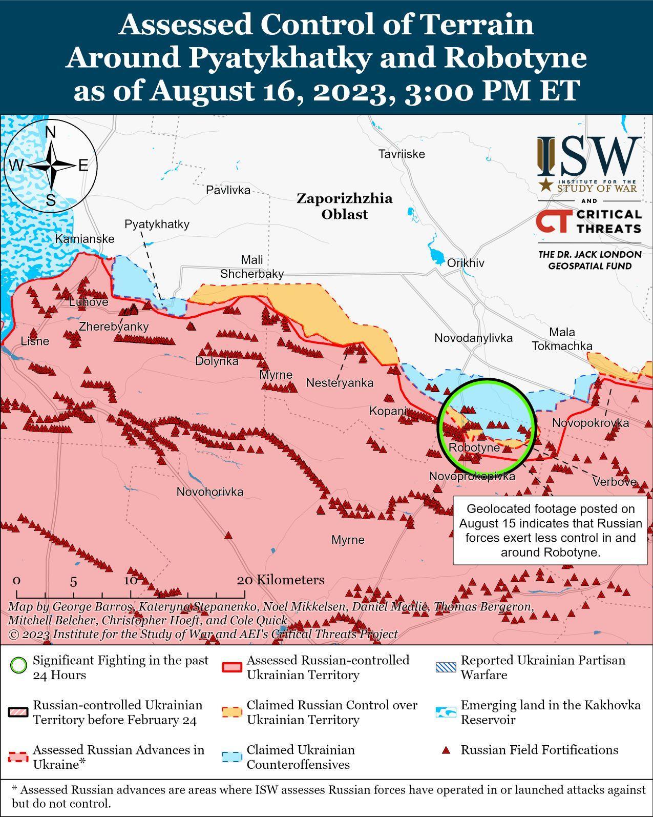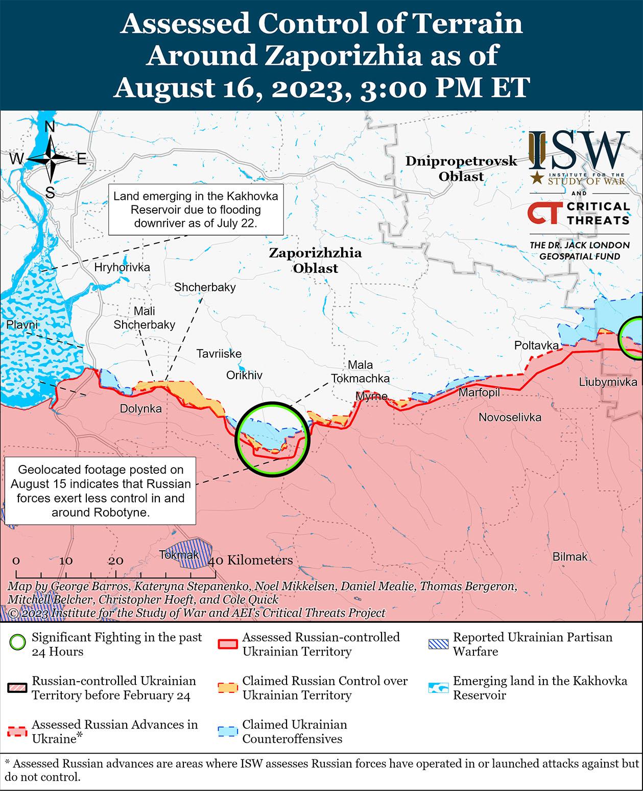 16 августа украинские силы продолжили наступательные действия на западе Запорожской области и продвинулись к востоку от Роботино. Геолокационные кадры, опубликованные 16 августа, указывают на то, что украинские силы продвинулись к северо-востоку от Роботино (10 км к югу от Орехова) и, вероятно, добились более значительных успехов в прилегающих районах, учитывая предыдущую последовательную активность Украины в лесных массивах к северо-востоку от населенного пункта. [63] Генштаб Украины сообщил, что украинские силы продолжают наступательные действия на Мелитопольском (запад Запорожской области) направлении. [64] Минобороны России заявило, что российские войска отразили два украинских штурмовых отряда возле Роботино и Вербового (18 км к юго-востоку от Орехова). [65] Российские военные блогеры утверждали, что небольшие украинские пехотные группы при поддержке бронетехники продолжали штурмы к северу и северо-востоку от Роботино, а также в направлении Вербово. [66] Российские блогеры утверждали, что северная часть Роботино в настоящее время оспаривается и что украинская техника может более свободно передвигаться в этом районе из-за того, что украинские силы разминируют минные поля. [67] Один из блогеров заявил, что недавние успехи Украины позволяют украинским силам оказывать постоянное давление на российские войска в районах, где больше нет мин. [68]