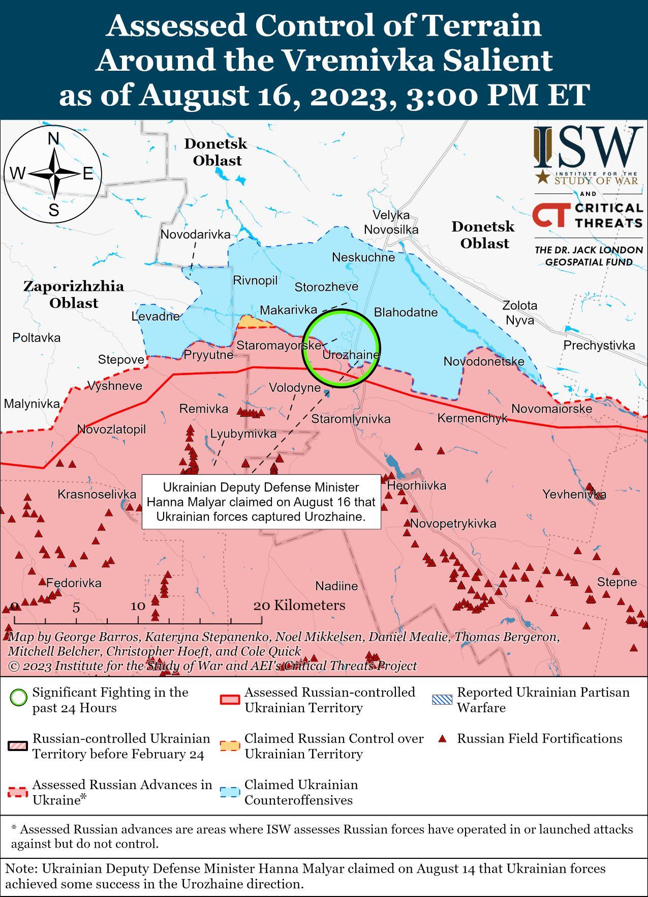 Украинские официальные лица сообщили, что 16 августа украинские силы освободили село Урожайное и продолжили контрнаступательные действия вдоль административной границы между Запорожской и Донецкой областями. [55] Заместитель министра обороны Украины Анна Маляр и Генштаб Украины сообщили, что украинские силы освободили Урожайное (9 км к югу от Великой Новоселки), а 35-я бригада морской пехоты Украины опубликовала кадры, на которых её личный состав поднимает украинский флаг в центре населенного пункта. [56] Украинские репортажи об освобождении Урожайного совпадают с предыдущими сообщениями украинских официальных лиц об освобождении других населенных пунктов в этом районе. [57] Российские источники широко игнорировали украинские сообщения об освобождении Урожайное после того, как выразили обеспокоенность по поводу слабых позиций России в урегулировании и заявлений о выводе российских войск за последние несколько дней. [58] Добровольческий батальон «Восток», обороняющийся вблизи Урожайное, заявил, что украинские силы в настоящее время атакуют к востоку от Урожайное в направлении Керменчика (15 км к юго-востоку от Великой Новоселки), а командир батальона «Восток» Александр Ходаковский заявил, что 12 августа украинские силы безуспешно пытались продвинуться в направлении Завитного Бажання (15 км к югу от Великой Новоселки). [59] Заявления России об украинских атаках к югу и востоку от Урожайное подтверждают украинские сообщения о том, что украинские силы контролируют населенный пункт. Российские блогеры утверждали, что продолжаются ожесточенные бои возле Старомайорского (9 км к югу от Великой Новоселки) и Урожайное, при этом один из блогеров утверждает, что российские войска контролируют позиции в южной части Урожайное. [60]