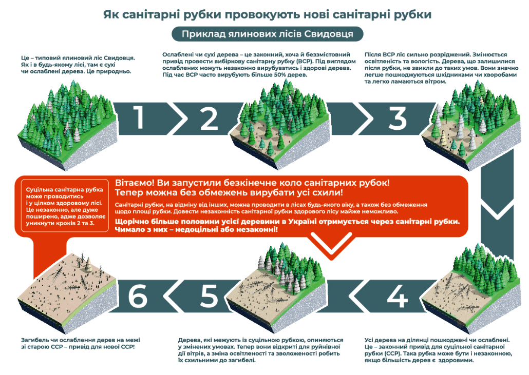 “Лікування” лісу за допомогою санітарних рубок призводить до того, що хворіють нові дерева та ділянки лісу. Іншими словами, це процес, який підживлює себе сам