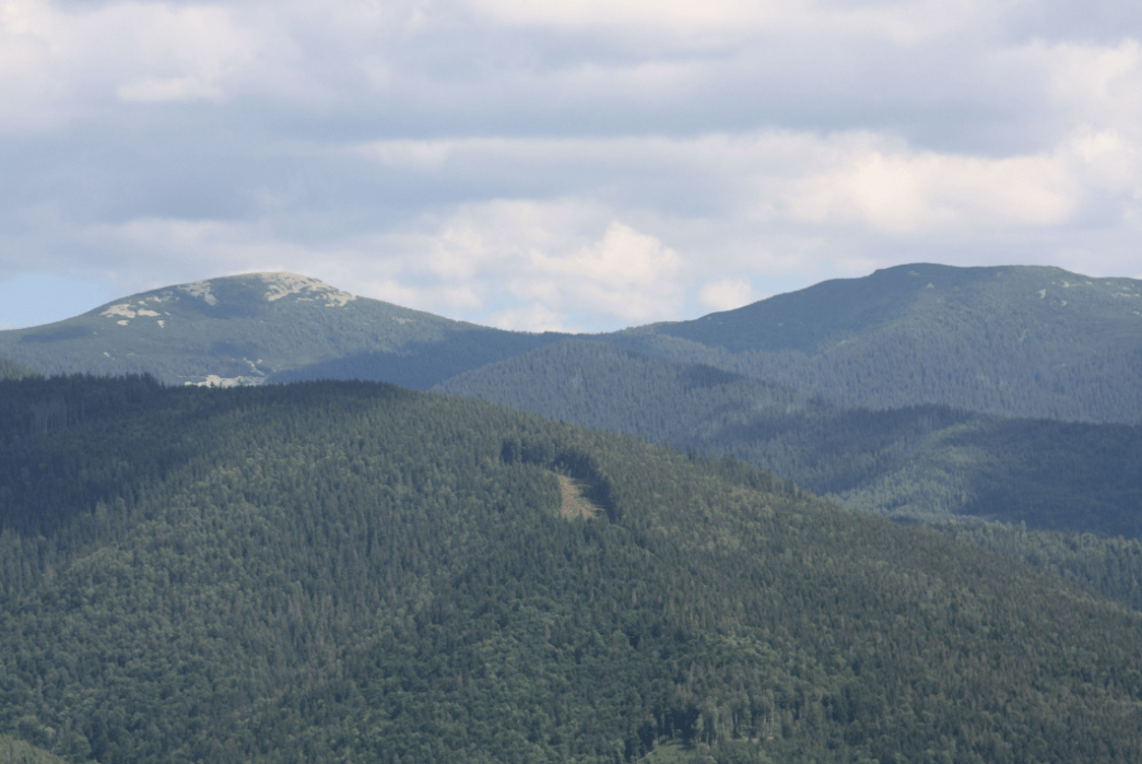 Посередині фото можна бачити вирубку. А на вершині ліворуч ліс не росте через цілком природні причини. Адже вершина та схили гори вкриті щільним шаром каміння. Це типова картина для цього регіону українських Карпат, що зветься Ґорґа́нами