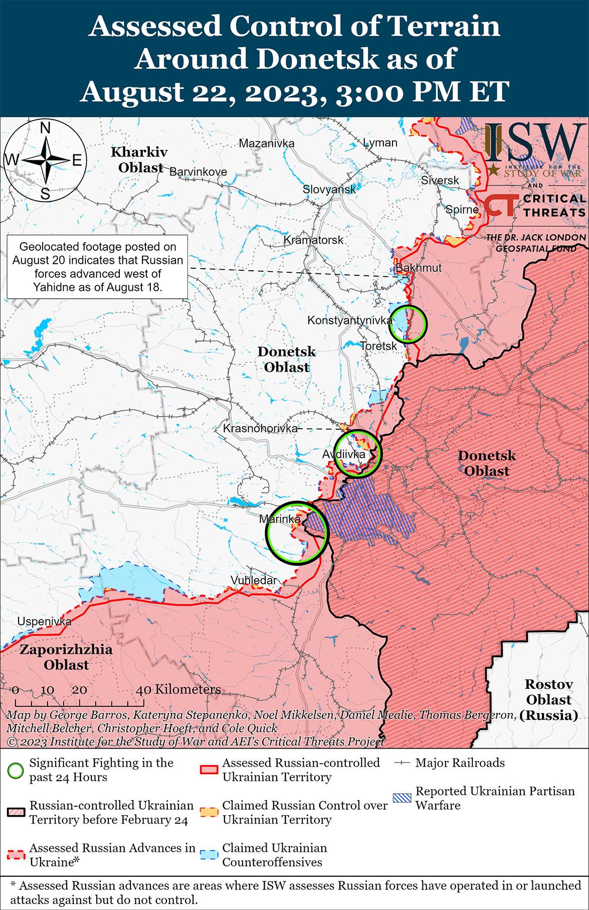 Российские источники утверждали, что украинские силы продолжали контрнаступательные действия вдоль административной границы между Донецкой и Запорожской областями 22 августа, но не продвинулись вперед. Украинский Генштаб не сообщал об украинской наступательной активности в районе границы Донецкой и Запорожской областей, хотя российские блогеры утверждали, что украинские силы продолжали безуспешные атаки вблизи Старомайорского (9 км к югу от Великой Новоселки) и Урожайного (9 км к югу от Великой Новоселки). [64] Другой российский блогер утверждал, что в настоящее время украинские силы пытаются окружить группу российских войск, удерживающую выступ возле Приютного (15 км к юго-западу от Великой Новоселки). [65] Российский батальон «Восток», который сейчас ведет бои под Урожайным, заявил, что украинские силы усиливают удары по российской транспортной технике вдоль проселочных дорог в пяти-семи километрах от фронта в районе границы Донецко-Запорожской области. [66]
