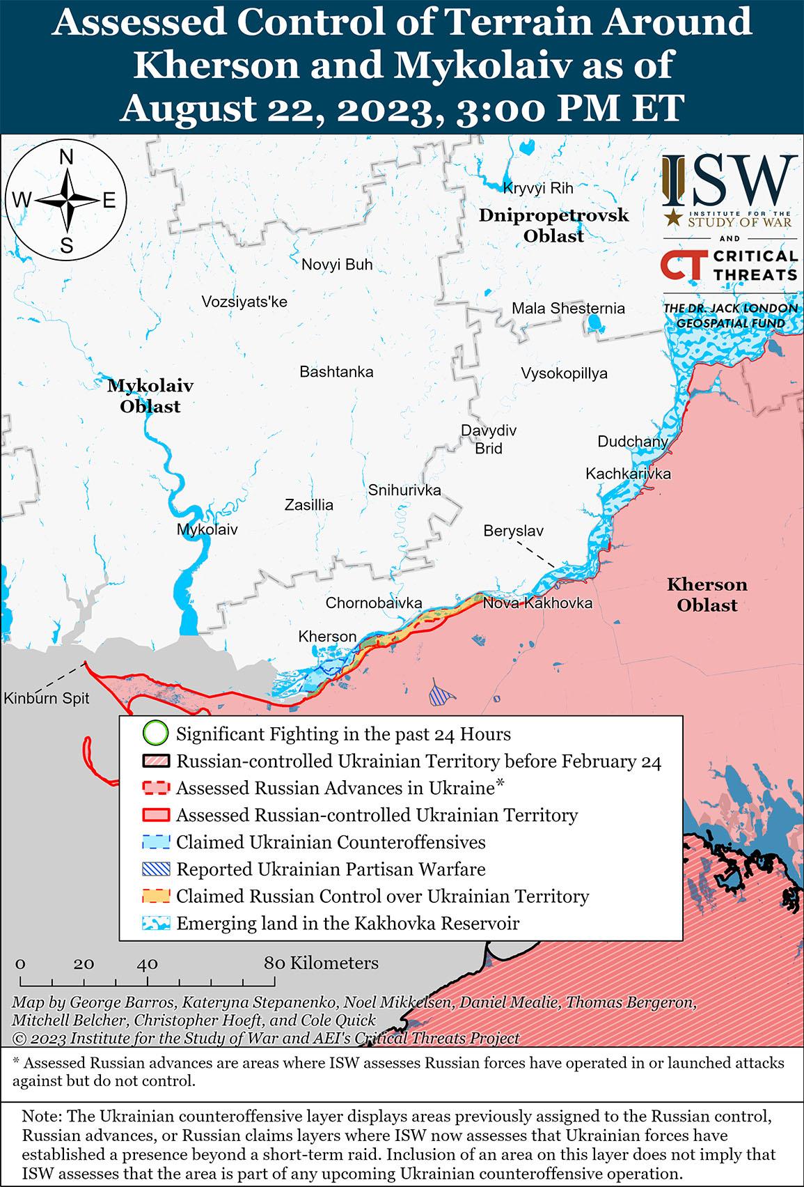22 августа украинские войска продолжили контрнаступательные операции на западе Запорожской области и добились дальнейших незначительных успехов. Геолокационные кадры, опубликованные 22 августа, показывают, что украинские силы продвинулись дальше в юго-восточное Роботино (10 км к югу от Орехова). [67] На геолокационных кадрах, опубликованных 21 августа, видно, что украинские войска незначительно продвинулись к западу от Новопокровка (13 км к юго-западу от Орехова). [68] 22 августа украинская 47-я механизированная бригада опубликовала видео, на котором видно, как ее личный состав успешно эвакуирует мирных жителей из Роботино. [69] 47-я механизированная бригада заявила, что ее личный состав прорвал многоэшелонированные российские оборонительные рубежи в районе Роботино и вошел в населенный пункт. [70] В Генштабе Украины сообщили, что украинские силы продолжают наступательные действия на Мелитопольском (запад Запорожской области) направлении. [71] Министерство обороны России заявило, что российские войска отразили украинские атаки в районе Балки, Успеновки (11 км к юго-востоку от Орехова) и Роботино. [72] Российские блогеры продолжали утверждать, что украинские силы закрепились на северной окраине Роботино и что большая часть населенного пункта в настоящее время оспаривается. [73] Один российский блогер утверждал, что украинские силы в настоящее время контролируют не менее половины Роботино и что подразделения 42-й мотострелковой дивизии (58-я общевойсковая армия, Южный военный округ), 7-й гвардейской воздушно-десантной дивизии (ВДВ), 810-й бригады морской пехоты (Тихоокеанский флот) и 1430-го мотострелкового полка территориальных войск (ТРВ) активно отражают украинские атаки в этом районе. [74] Другие российские военные блогеры утверждали, что российские силы продолжают отражать периодические атаки украинской армии на российские позиции на юге Роботино и что украинские силы совершали неуказанные наступления в направлении Вербового (18 км к юго-востоку от Орехова).[75]