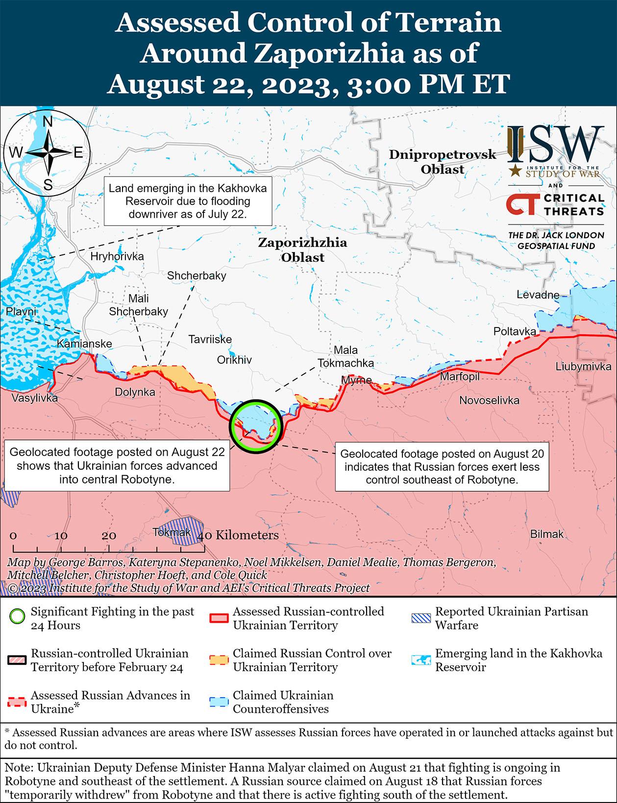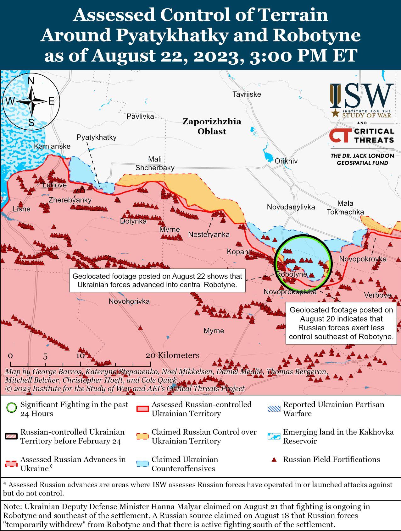 - По состоянию на 22 августа украинские силы продолжали продвигаться в Роботино и его окрестностях на западе Запорожской области на фоне признаков того, что российские войска, вероятно, имеют ограниченное присутствие в населенном пункте.
