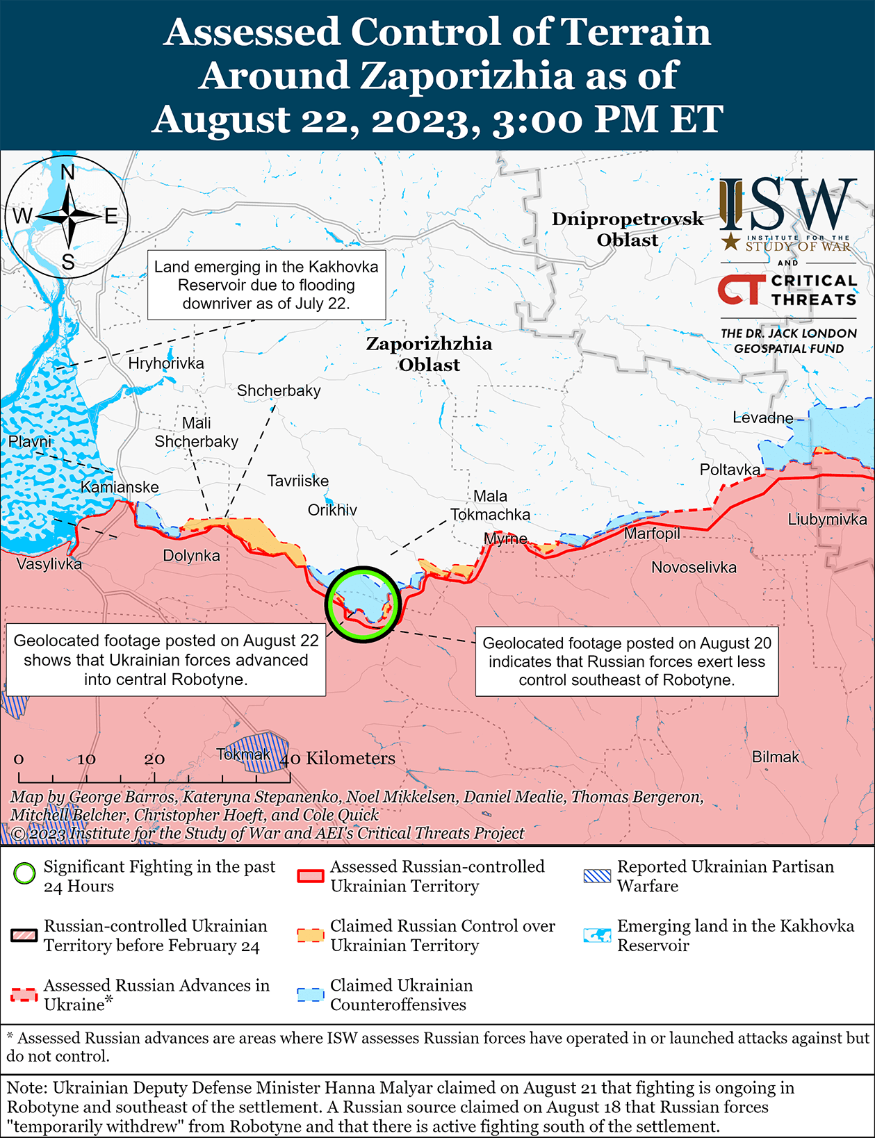 Российские источники утверждали, что российские войска успешно контратаковали на западе Запорожской области 22 августа. Российские военные блогеры утверждали, что в ночь с 21 на 22 августа российские войска контратаковали украинские силы в центре Роботино и отбили позиции. [76] Один из блогеров утверждал, что 22 августа российские войска продолжали оттеснять украинские силы из центра Роботино на северную окраину населенного пункта. [77] Однако ISW не наблюдал визуального подтверждения этих утверждений.