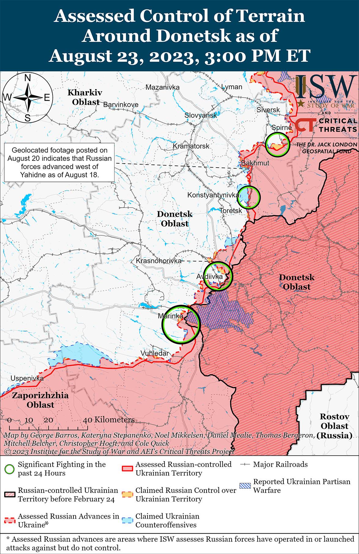 Российские источники утверждали, что украинские силы продолжали наземные атаки на направлении Авдеевка-Донецк 23 августа, но не продвинулись. Минобороны России заявило, что подразделения Южной группировки войск РФ отразили украинскую атаку в районе Невельского (непосредственно к западу от Донецка). [73]