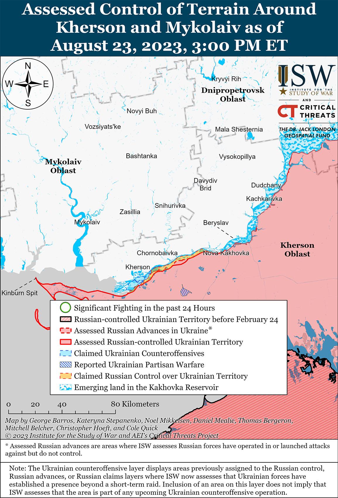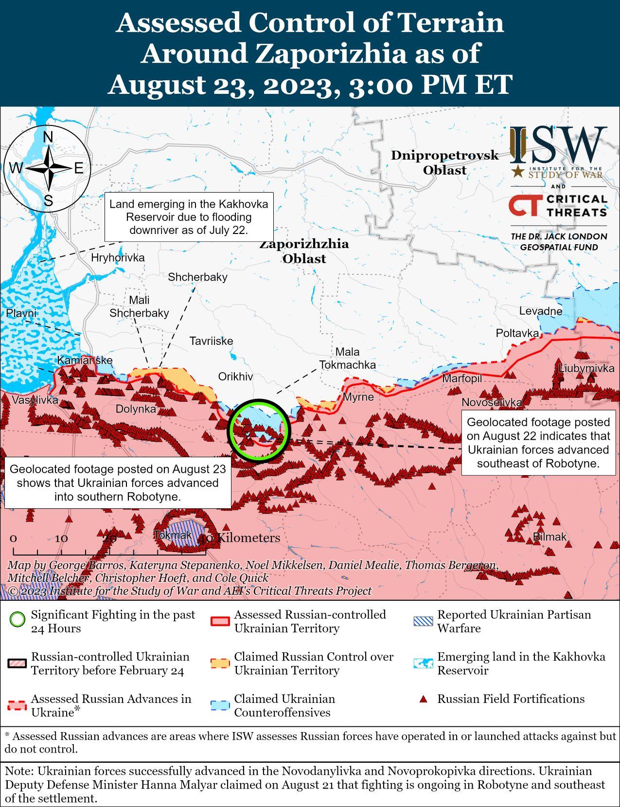 23 августа украинские силы продолжили наступательные действия и добились тактических успехов на западе Запорожской области. На геолокационных кадрах, опубликованных 22 августа, видно, что украинские силы продвинулись к юго-востоку от Роботино (10 км к югу от Орехова) и к северо-западу от Вербового (18 км к юго-востоку от Орехова). [79] На геолокационных кадрах, опубликованных 23 августа украинскими источниками, в том числе главнокомандующим Валерием Залужным, видно, что украинские силы установили флаг на юге Роботино, что указывает на то, что российские войска, вероятно, имеют ограниченные оставшиеся позиции в селе. [80] Генштаб Украины сообщил о неустановленных успехах украинских сил в направлениях Новоданиловка (5 км к югу от Орехова) и Новопрокоповка (13 км к юго-востоку от Орехова). [81] Российские блогеры в основном утверждали, что продолжаются бои за контроль над Роботино и что российские войска отразили украинские атаки в населенном пункте и его окрестностях. [82] Некоторые блогеры утверждали, что российские войска вытеснили украинские войска из центра на северную окраину Роботино и что российские войска сохраняют контроль над южным Роботино. [83]
