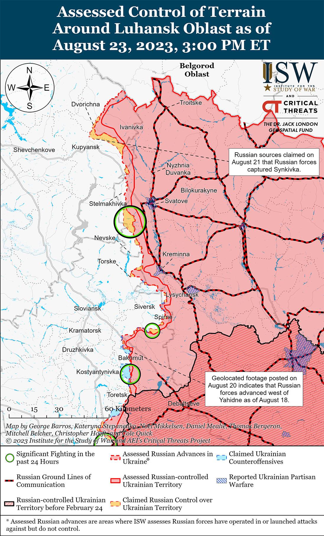 23 августа российские войска продолжили ограниченные наступательные действия на рубеже Купянск — Сватово — Кременная, но не добились каких-либо подтвержденных успехов. В Генштабе Украины сообщили, что российские войска вели безуспешные наступательные действия вблизи Новоегоровка (16 км к юго-западу от Сватово). [61] Пресс-атташе Западной группировки войск Ярослав Якимкин заявил, что российские войска продолжили наступательные действия вблизи Ольшана (13 км к северо-востоку от Купянска) и захватили украинский опорный пункт и два украинских наблюдательных пункта. [62] Российский блогер заявил, что неуказанные российские добровольческие батальоны ведут штурм вблизи Белогоровки (12 км к югу от Кременной) и частично окружают украинские силы в населенном пункте, хотя ISW не видел визуальных подтверждений российских позиций в этом районе, соответствующих угрозе окружения. [63]