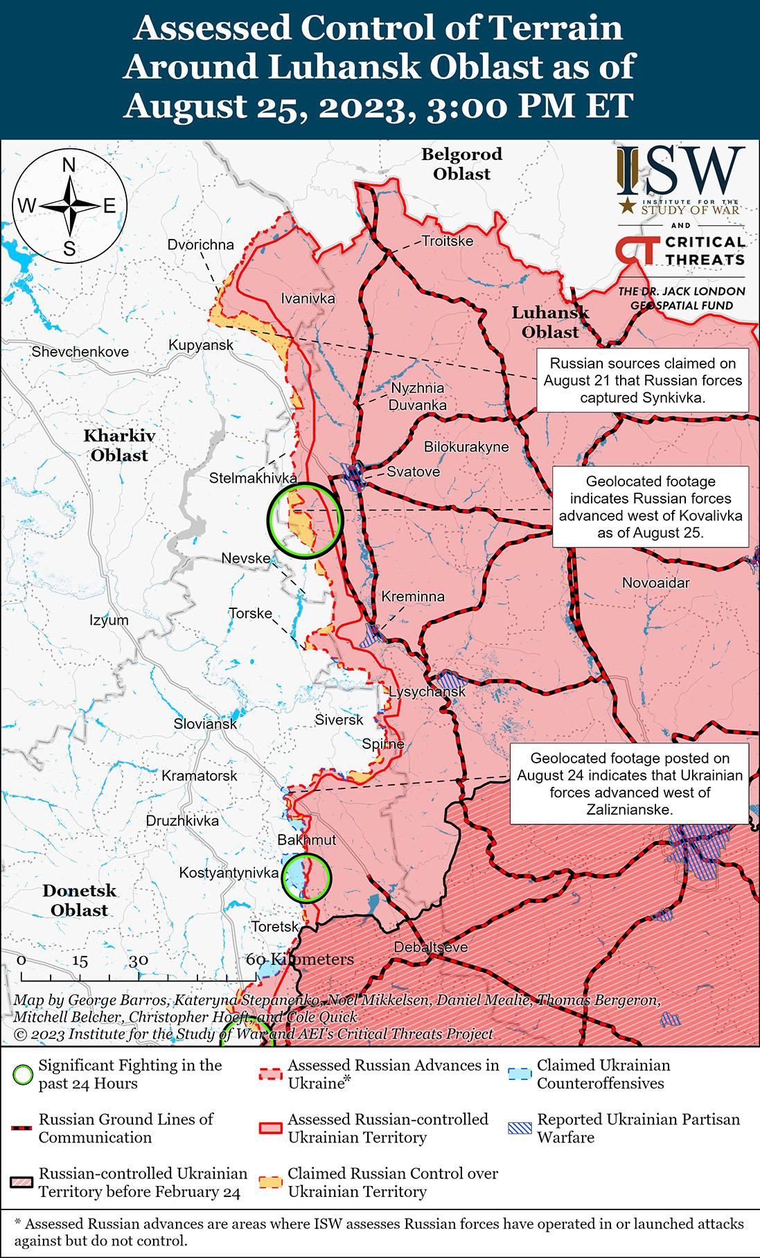 25 августа враг продолжил наступательные действия на рубеже Купянск — Сватово — Кременная и продвинулся вперед. Геолокационные кадры, опубликованные 25 августа, указывают на то, что российские войска продвинулись к западу от Ковалевки (14 км к юго-западу от Сватово). [42] В Генштабе Украины сообщили, что российские войска провели неудачные наступательные действия вблизи Новоегоровка (17 км к юго-западу от Сватово). [43] Командующий Сухопутными войсками Украины генерал-полковник Александр Сырский заявил, что после месяца ожесточенных боев и значительных потерь российские войска перебрасывают вновь сформированные бригады и дивизии на Купянское и Лиманское направления, чтобы возобновить активные наступательные действия на этих направлениях. [44] Однако ISW не обнаружил признаков прибытия новых российских частей или соединений на этот участок фронта.
