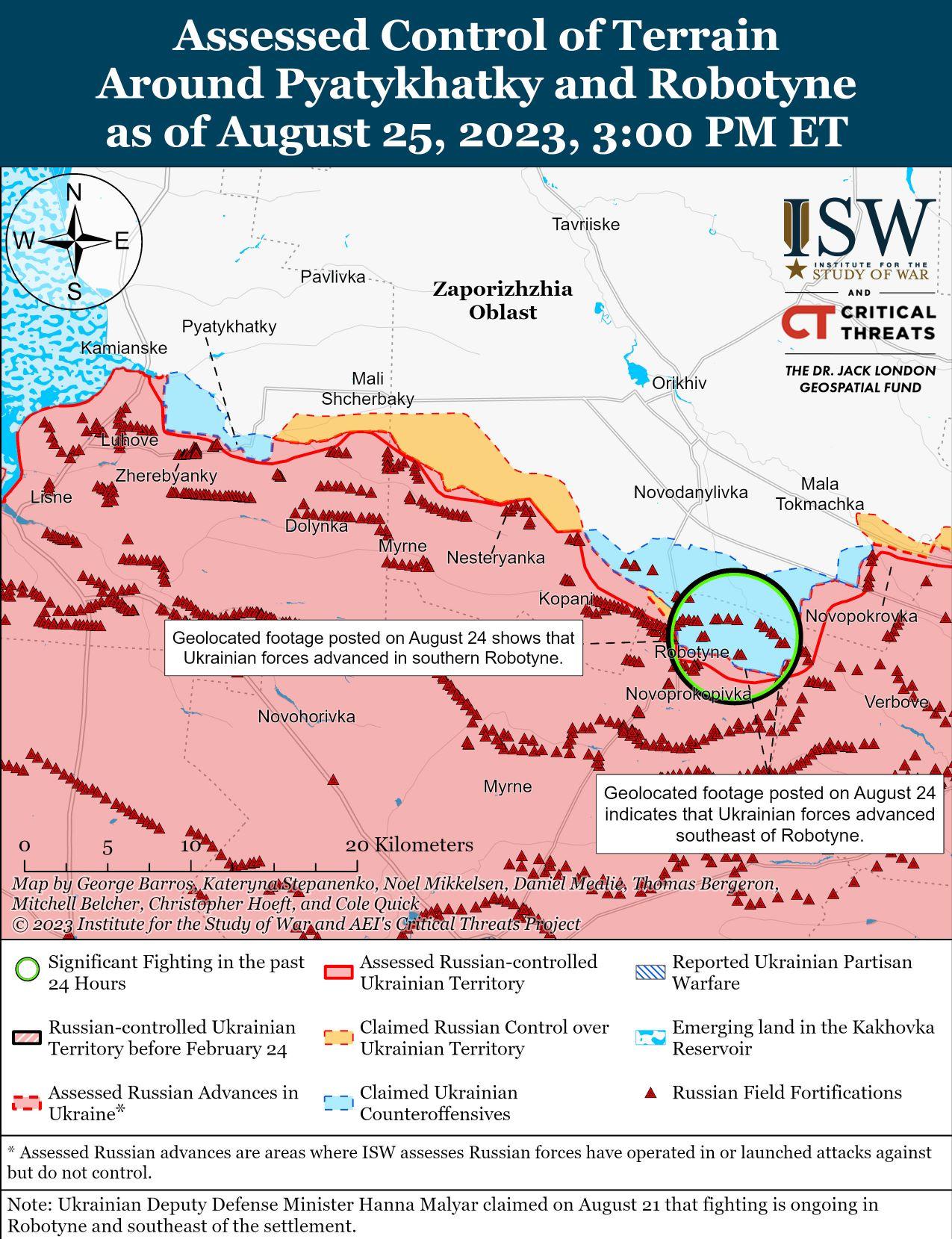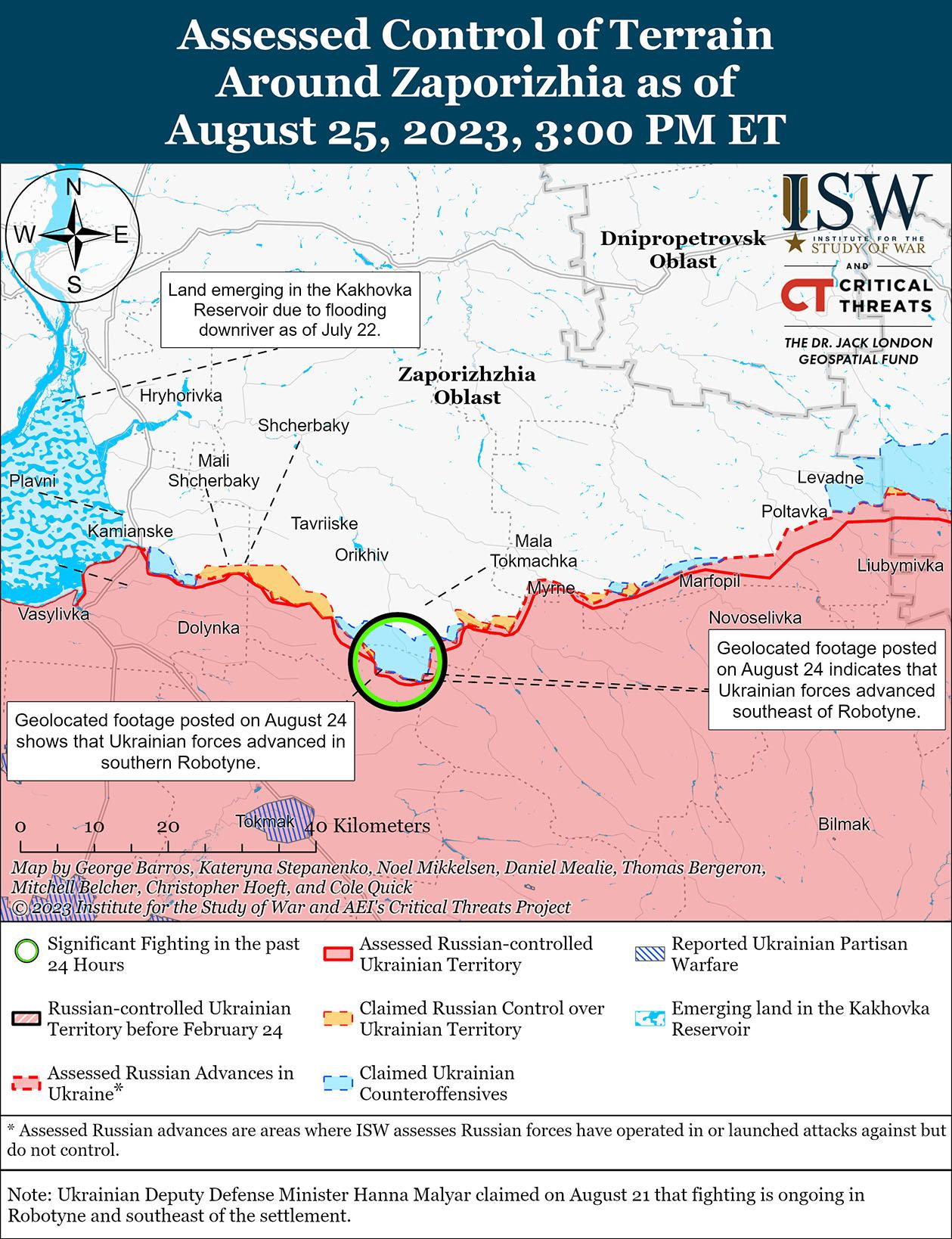 25 августа украинские силы продолжили контрнаступательные операции возле Роботино на западе Запорожской области и, как сообщается, продвинулись вперед, поскольку российские блогеры выразили обеспокоенность по поводу отсутствия подкреплений и ротации войск в этом районе. Генштаб Украины сообщил, что украинские силы добились неопределенных успехов в направлении Новоданиловка-Новопрокоповка (5-13 км к югу от Орехова) и линии Малая Токмачка – Очеретуватое (9-25 км к юго-востоку от Орехова). [25] Известный российский блогер выразил обеспокоенность по поводу способности уставших от боев российских войск защищаться от возможного возобновления украинских атак в районе Роботино (10 км к югу от Орехова) на фоне заявлений о том, что боевые действия переместились на юг Роботино. [26] Военный блогер утверждал, что многие российские военнослужащие, воюющие под Роботино, находятся на передовой с начала украинского контрнаступления и что эти подразделения борются с нехваткой фронтовых подкреплений. [27] Это утверждение подтверждает оценку ISW о том, что российские войска, воюющие на западе Запорожской области, защищались от украинских атак с начала контрнаступления без ротации или значительного подкрепления. [28]