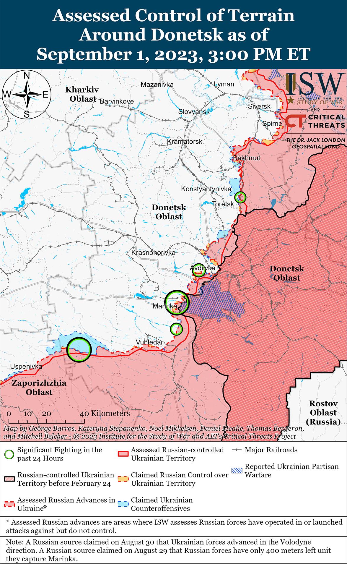 1 сентября украинские войска продолжили наступательные действия в районе Бахмута и незначительно продвинулись к югу от Бахмута. На геолокационных кадрах, опубликованных 1 сентября, видно, что украинские силы незначительно продвинулись к северо-западу от Клещеевки (7 км к юго-западу от Бахмута). [48] Генштаб Украины сообщил, что украинские силы продолжают наступательные действия к югу от Бахмута. [49] Министерство обороны России утверждало, что за последнюю неделю украинские войска неоднократно безуспешно атаковали районы населенных пунктов Клещеевка и Малиновка (24 км к северо-западу от Бахмута). [50] Известный российский блогер заявил, что украинские силы продолжают попытки захватить Клещеевку. [51] Другой российский блогер опубликовал кадры, на которых видно, как бойцы 200-й мотострелковой бригады (14-й армейский корпус Северного флота) отражают украинские атаки на Бахмутском направлении. [52]