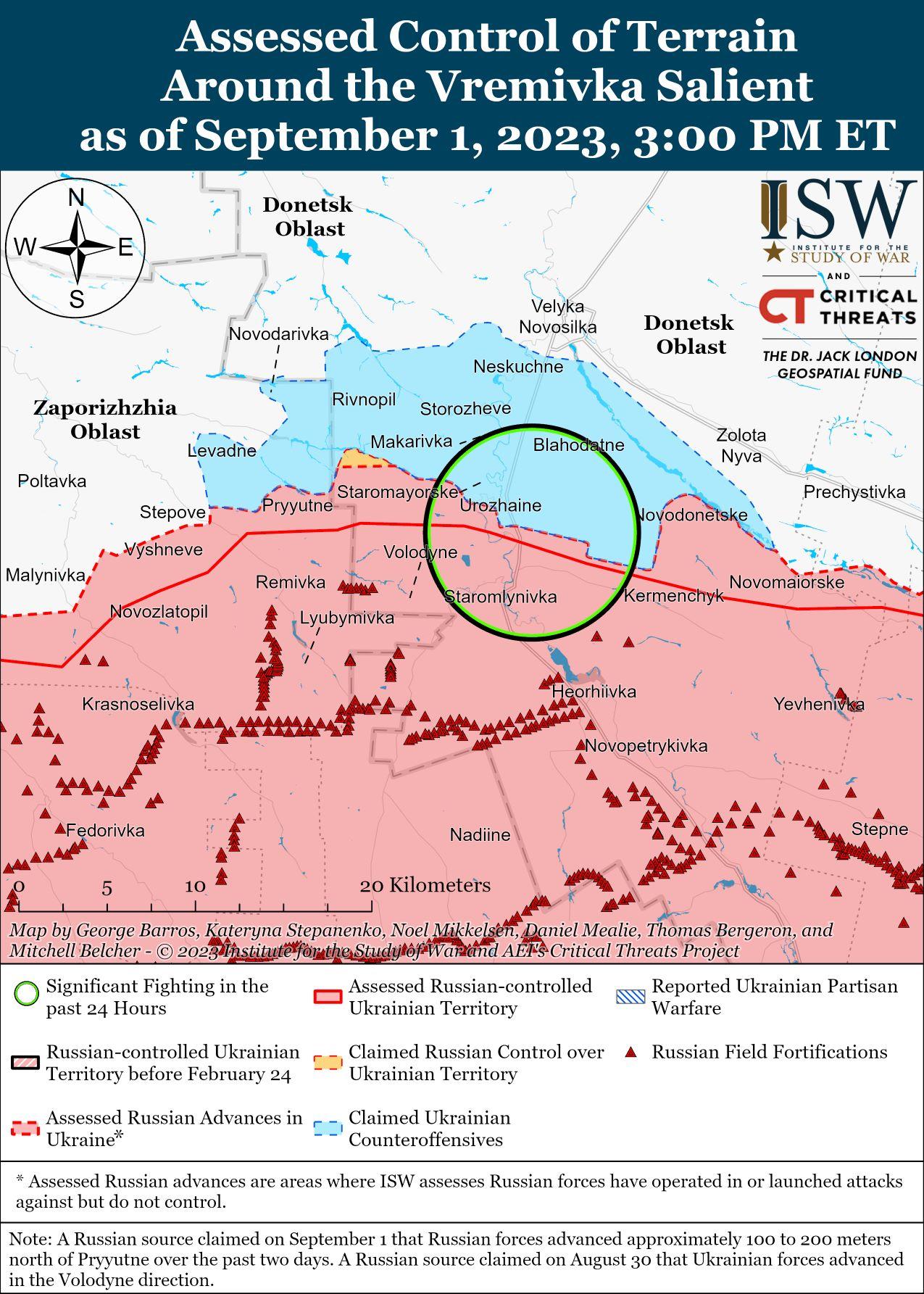 Сообщается, что украинские силы продолжали наступательные действия в районе границы Донецкой и Запорожской областей, но 1 сентября не продвинулись вперед. Официальный представитель Восточной группировки войск России Олег Чехов заявил, что российские войска отразили украинскую атаку в направлении Приютного (15 км к юго-западу от Великой Новоселки). [60] Другие российские источники утверждали, что небольшие украинские группы атаковали в направлении Старомлыновки (14 км к югу от Великой Новоселки) и что украинские силы ведут наступательные действия вблизи Старомайорского (9 км к югу от Великой Новоселки). [61] Командир российского батальона «Восток» Александр Ходаковский выразил разочарование неадекватностью российского контрбатарейного огня вблизи Урожайного (9 км к югу от Великой Новоселки) и вдоль линии Новомайорское-Новодонецкое-Керменчик (12–18 км к юго-востоку от Великой Новоселки), утверждая, что российской артиллерии в этом районе требуется несколько дней, чтобы нанести удар по украинским позициям, в то время как украинские силы не страдают от таких ограничений. [62] Ходаковский заявил, что российские войска, обороняющиеся в этом районе, находятся под сильным физическим и психологическим стрессом, и предупредил, что этот стресс повлияет на обороноспособность российских войск в этом районе. [63]