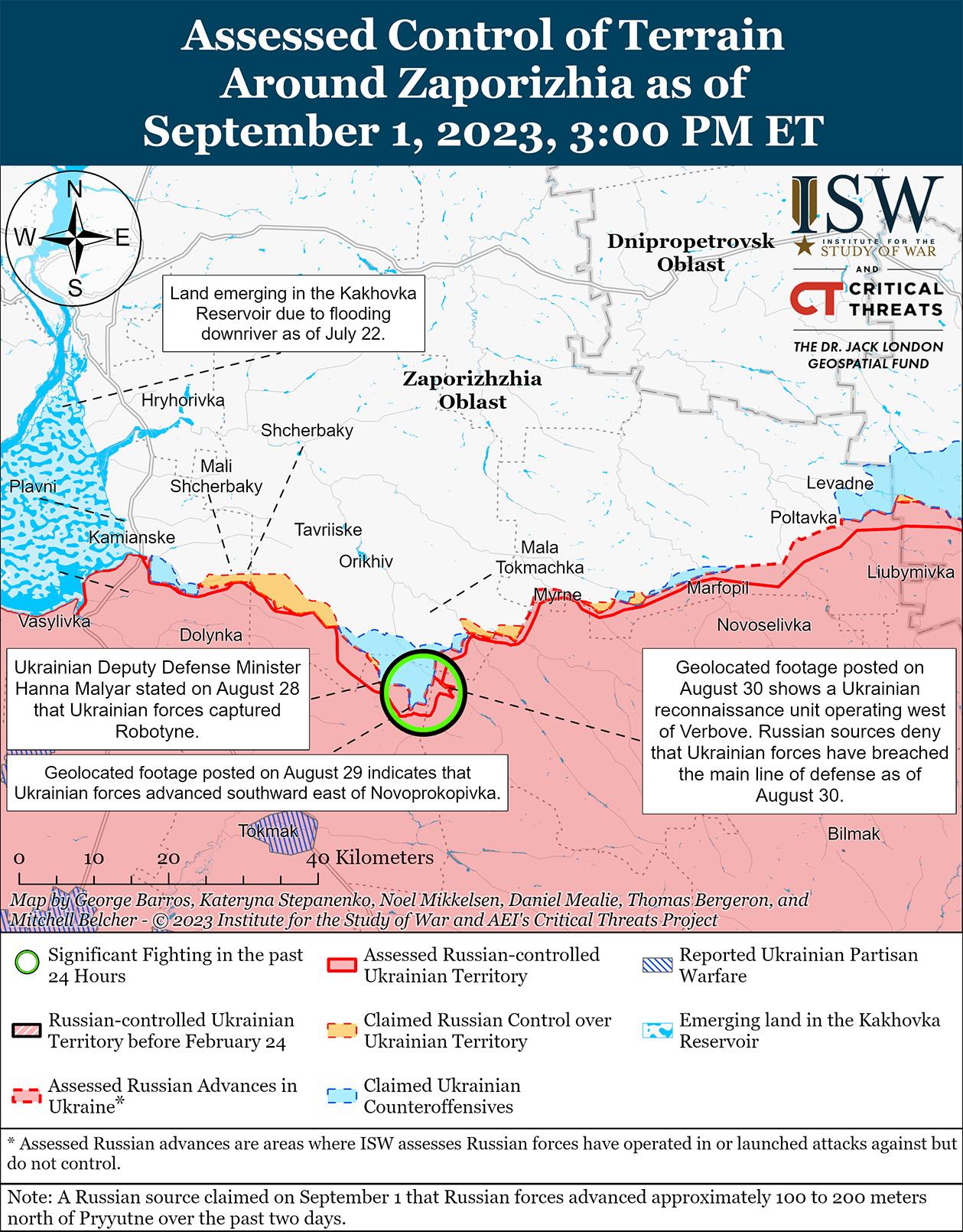 - Украинские силы продолжили наступательные действия вблизи Бахмута и на западе Запорожской области и 1 сентября добились некоторых успехов.