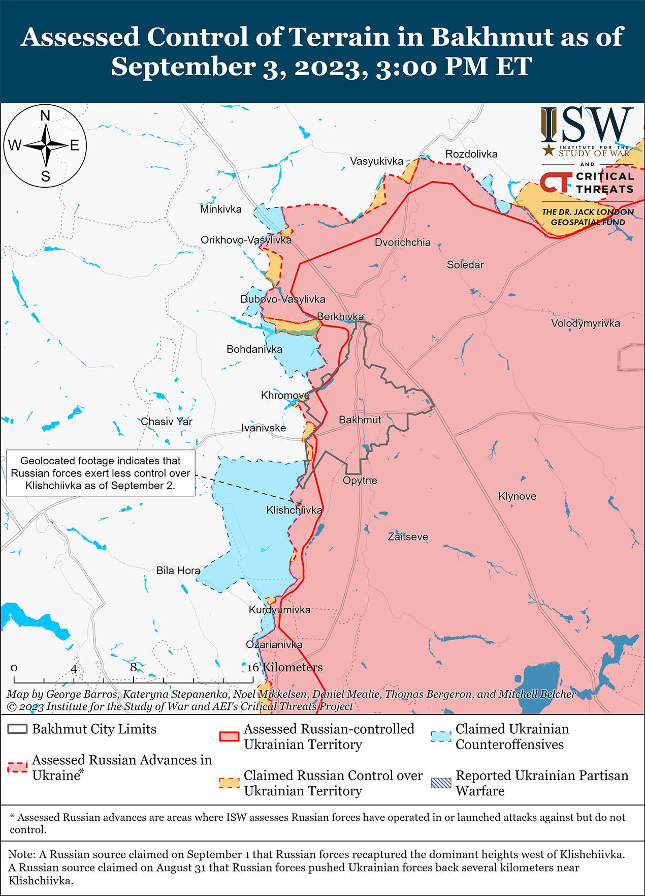 Украинские силы продолжили наступательные действия в районе Бахмута и продвинулись 3 сентября. На геолокационных кадрах, опубликованных 3 сентября, видно, что украинские войска продвинулись дальше в южную часть Клещеевки (7 км к юго-западу от Бахмута). [47] Министерство обороны России утверждало, что подразделения Южной группировки войск России отражали украинские атаки вблизи Железнянского (12 км к северо-западу от Бахмута), Дубово-Васильевки (6 км к северо-западу от Бахмута), Бахмута и Клещеевки (7 км к юго-западу от Бахмута). [48] Известный российский блогер заявил, что украинские войска продолжают штурмовать высоты возле Клещеевки. [49] По словам блогера, украинские силы снизили темп боевых действий в районе Берховского водохранилища к северу от Бахмута. [50] 2 сентября другой российский блогер заявил, что российские войска отразили украинскую атаку в районе Берховки (6 км к северу от Бахмута). [51] Связанный с Кремлем российский блогер заявил, что вечером 15 сентября украинские силы провели разведку боем возле Зализнянского и Раздоловки (2 км к северо-востоку от Бахмута). [52] Военный блогер также утверждал, что российские войска отразили четыре украинских атаки на линии Бахмут — Клещеевка. [53]