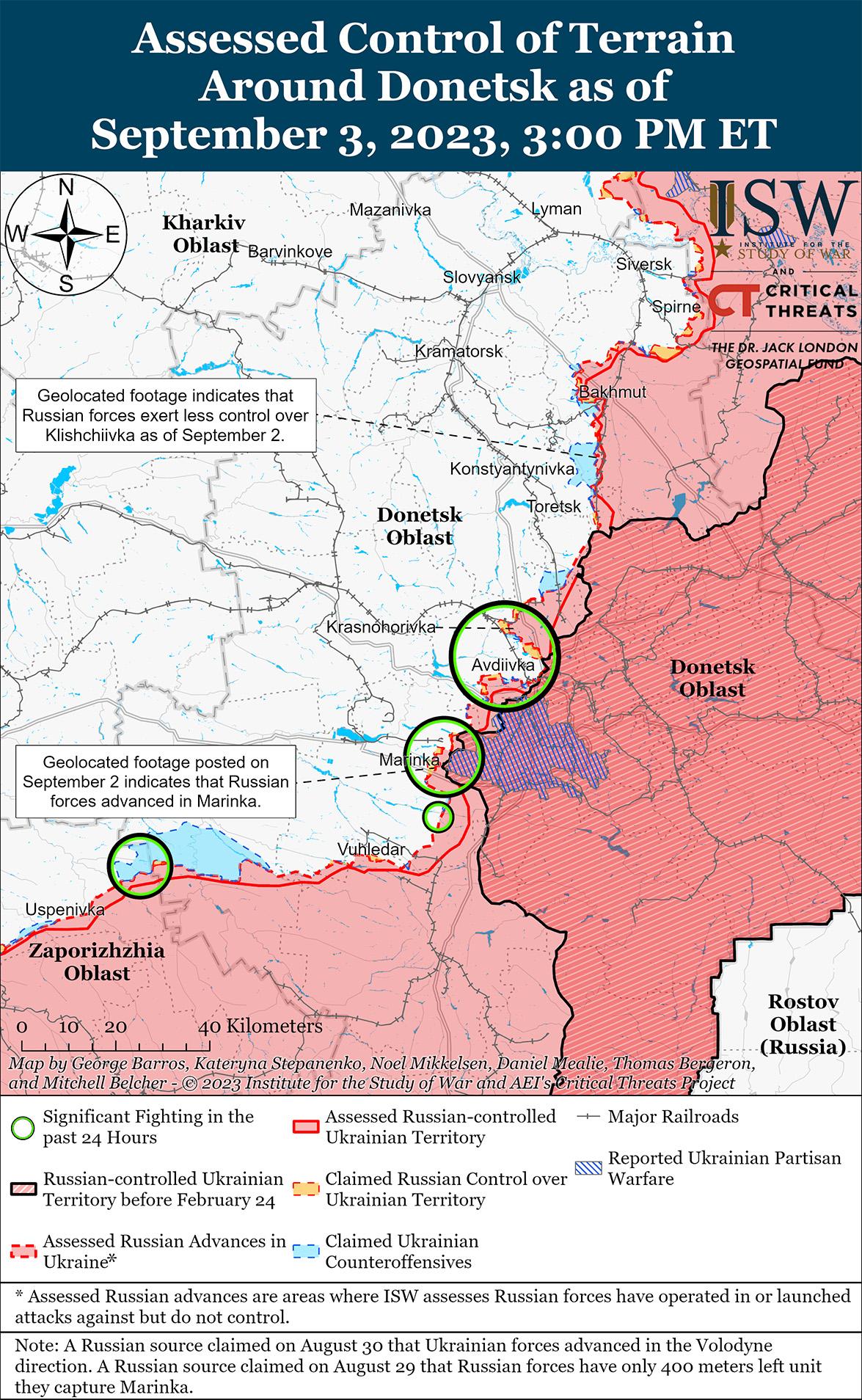 3 сентября российские войска продолжили наступательные действия вдоль линии Авдеевка-Донецк и продвинулись вперед. Геолокационные кадры, опубликованные 2 сентября, указывают на то, что российские войска продвинулись в Марьинке. [59] 3 сентября Генштаб Украины сообщил, что российские войска вели безуспешные наступательные действия к востоку от Северного (6 км к западу от Авдеевки), вблизи Авдеевки и Марьинки, а также к югу от Красногоровки (непосредственно к западу от Донецка) и Новомихайловки (10 км к юго-западу от Донецка). [60] Российский блогер заявил, что российские войска вели штурмовые действия на окраинах Красногоровки. [61] Другой российский блогер распространил кадры, на которых видно, как подразделения 9-й мотострелковой бригады (1-го армейского корпуса ДНР) наносят удары по украинским позициям на Авдеевском направлении. [62]