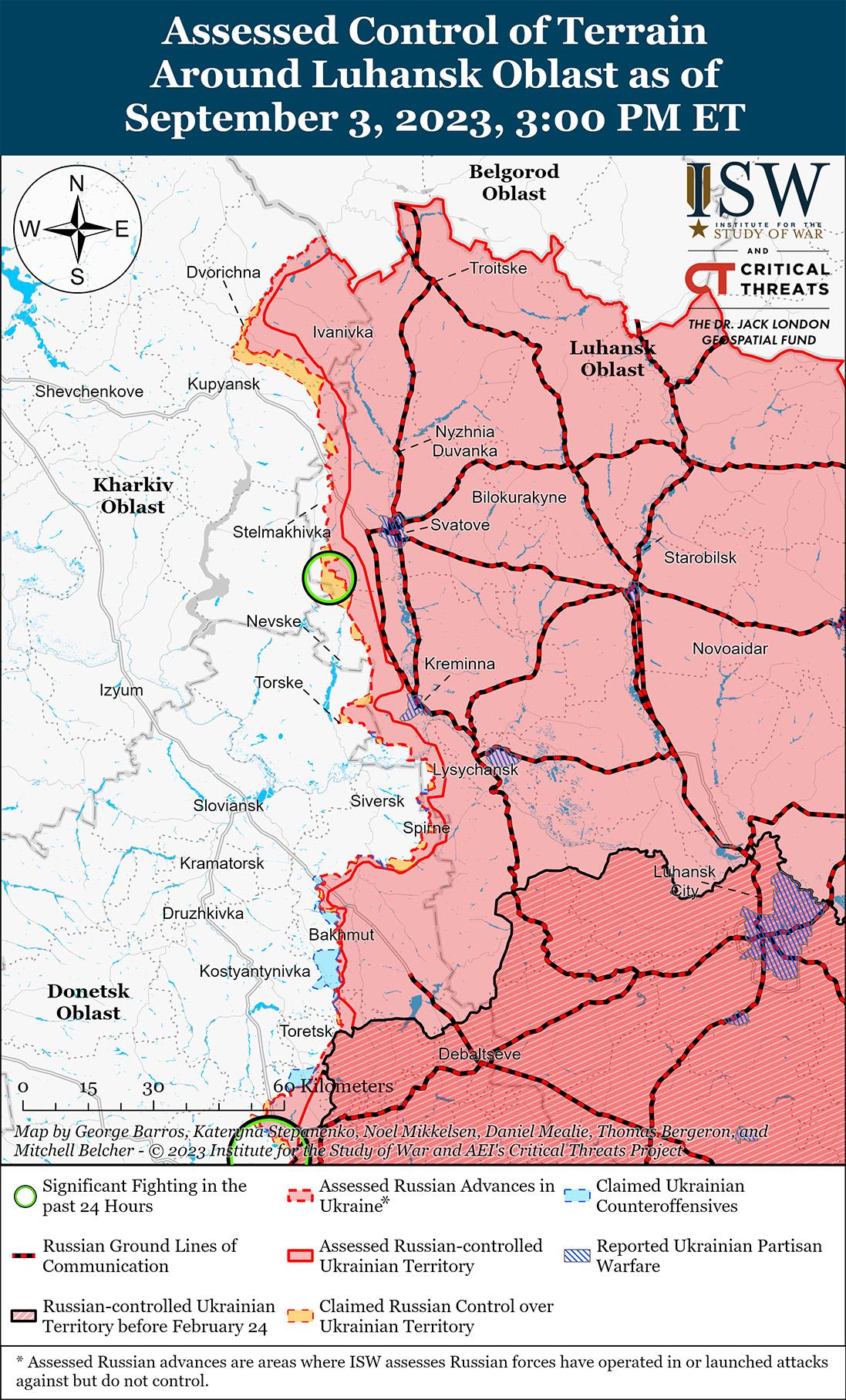 Российские источники утверждали, что 3 сентября украинские силы провели ограниченные безуспешные наземные атаки вдоль линии Купянск-Сватово-Кременная. 3 сентября Министерство обороны России заявило, что российские войска отразили украинские контратаки возле Сергеевки (13 км к западу от Сватово), Григоровки (11 км к югу от Кременной) и Кузьмино (6 км к юго-западу от Кременной). [45] Официальный представитель Центральной группировки войск России Александр Савчук заявил, что российские войска отражали украинские атаки вблизи Торское (15 км к западу от Кременной) и Серебрянского лесничества к югу от Кременной. [46]
