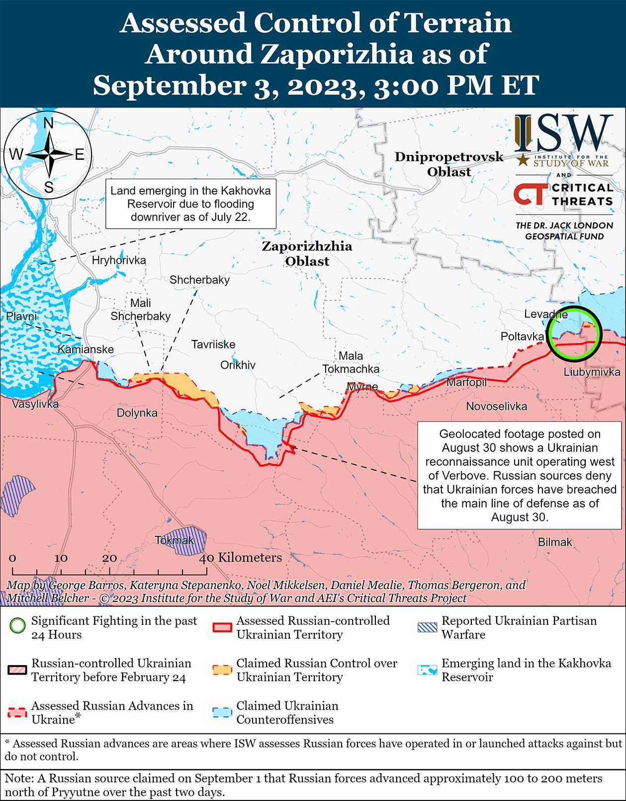 Украинские силы 3 сентября провели наступательные операции в западном Запорожье и, как сообщается, продвинулись вперед. Пресс-секретарь Таврийской группы войск Украины Александр Штупун заявил, что украинские силы достигли неопределенных успехов в направлении Вербового (18 км к юго-востоку от Орехова).[66] Российский военный блогер заявил 2 сентября, что украинские силы расширяют свой плацдарм между Новопрокоповкой (13 км к югу от Орехова) и Вербовым.[67] Военный блогер заявил, что украинские силы контролируют северную и центральную часть Роботино (10 км к югу от Орехова), в то время как южная часть населенного пункта является оспариваемой.[68] Некоторые российские военные блогеры утверждали, что российские войска сохраняют контроль над южными окраинами Роботино, в то время как другие утверждали, что российские войска отступили на юг.[69] Российские источники, в том числе в Министерстве обороны России (МО), заявили, что украинские силы безуспешно атаковали районы Роботино и Вербовое.[70] Российский источник заявил 2 и 3 сентября, что украинские силы продолжают наступление в районе Вербового с северо-запада.[71] Другой российский военный блогер заявил, что украинские силы наступают восточнее Новопрокоповки в направлении Пшеничного (17 км к юго-востоку от Орехова).[72]