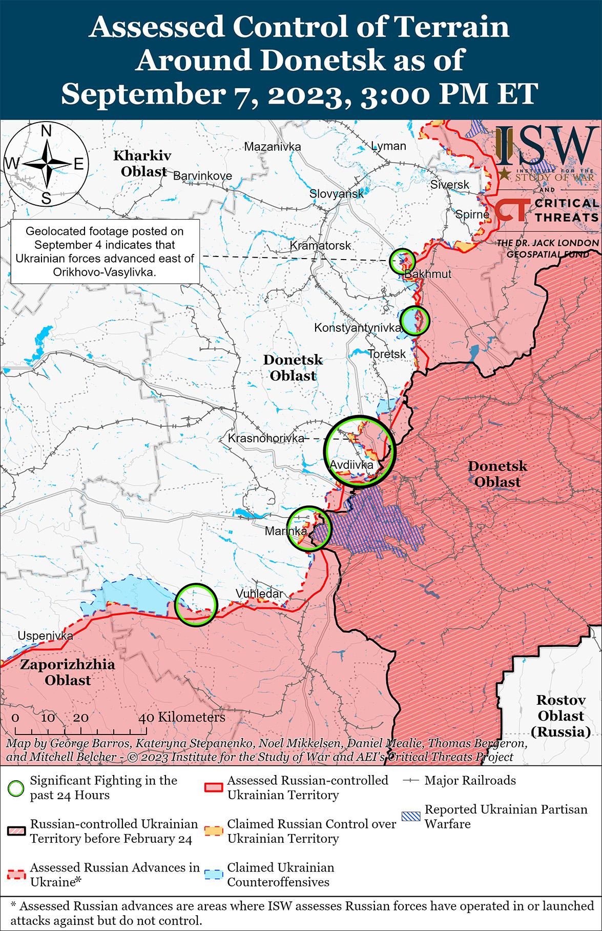 - 7 сентября украинские силы продолжили наступательные действия вблизи Бахмута и на западе Запорожской области и добились дальнейших успехов на обоих участках фронта.