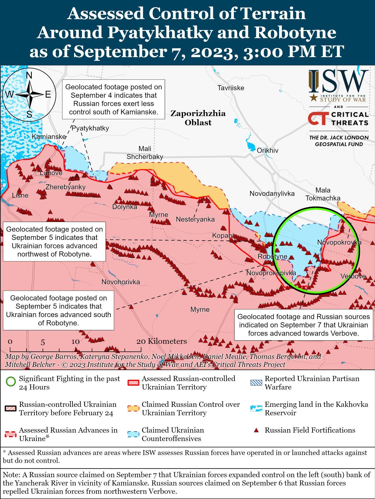 7 сентября украинские войска продолжили контрнаступательные действия на западе Запорожской области и продвинулись вперед. Геолокационные кадры, опубликованные 7 сентября, указывают на то, что украинские силы продвинулись к северо-западу от Вербового (18 км к юго-западу от Орехова). [45] Известный российский блогер утверждал, что украинские войска продвинулись в этом районе, а другие блогеры утверждали, что 6 сентября украинские войска временно продвинулись на северо-западную окраину Вербовое, что, вероятно, указывает на дальнейшее недавнее продвижение украинских войск к северо-западу от населенного пункта. [46] Российский блогер утверждал, что российские войска оттеснили украинские силы с северо-западной окраины Вербовое, но ISW не заметил, что украинские силы удерживают позиции достаточно близко к северо-западной окраине Вербовое, чтобы российские войска могли с самого начала отбить их с окраины. [47] На спутниковых снимках, сделанных 6 сентября, видна горящая листва на линии деревьев примерно в километре к северо-западу от Вербовое, что позволяет предположить, что российские войска ведут огонь по наступающим украинским войскам в этом районе. [48] Спикер Таврийской группировки войск Александр Штупун заявил, что 6 сентября украинские войска продвинулись к югу от Роботино и к западу от Вербового. [49] Российский блогер утверждал, что украинские войска пытались прорвать российскую оборону к востоку от Новопрокоповки (13 км к югу от Орехова) и добились неопределенных успехов в этом районе. [50] Российские источники утверждали, что российские войска продолжали отражать механизированные украинские атаки вдоль линии Роботино-Вербовое. [51]