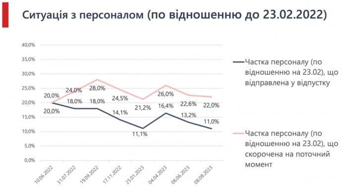 Частка фактору персоналу порівняно з 23 лютого 2022 року впала з 26% у квітні до 22%. Крім того, до 11% покращилася ситуація з прихованим безробіттям (відправлена у відпустку частка персоналу порівняно з 23 лютого 2022 року).