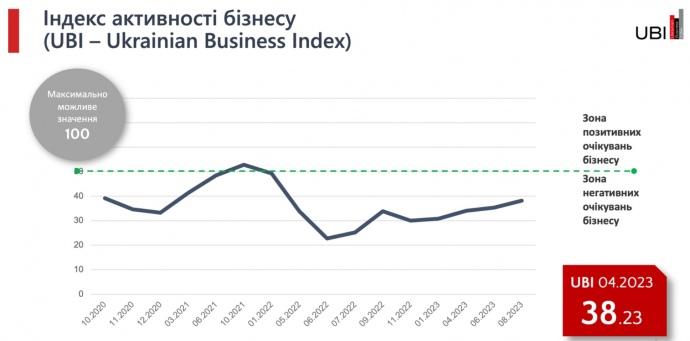 Індекс активності бізнесу UBI (Ukrainian Business Index) в серпні 2023 року становить 38,23 із 100 можливих. Індекс незначно зріс порівняно з червнем 2023 року (35,34) і локальним мінімумом вересня 2022 року (33,9).