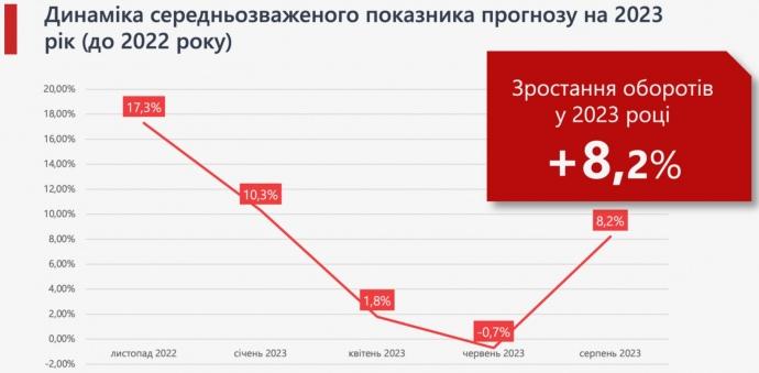 Середньозважений очікуваний показник оборотів бізнесу у 2023 проти 2022 року показав зростання з -0,7% в червні 2023 року до +8,2% в серпні 2023 року.