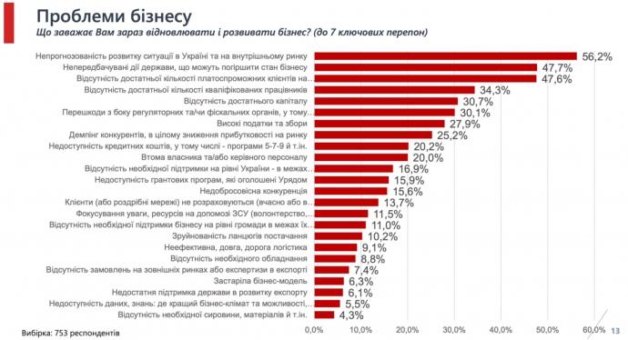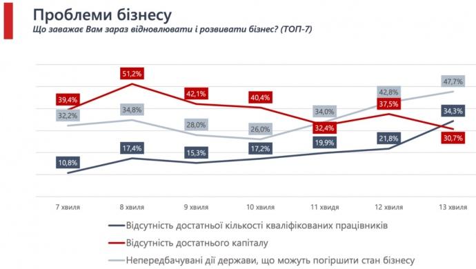 Найбільше заважає бізнесу у відновленні непрогнозованість розвитку ситуації в Україні та на внутрішньому ринку – 56,2%. На другому місці – непередбачувані дії держави, що можуть погіршити стан бізнесу (47,7%). Іншими важливими чинниками є нестача фінансових ресурсів, а саме неплатоспроможність клієнтів (47,6%), недоступність кредитних коштів і недостатність власного капіталу.