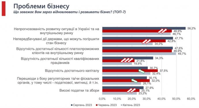 Порівняно з червнем 2023 року, суттєвішою проблемою для бізнесу стала непрогнозованість розвитку ситуації в Україні та на внутрішньому ринку – 56,2% (46,9% в червні). Значно зросли ризики й проблеми, пов’язані з податковою та митною системами. Важливим фактором стала нестача платоспроможних клієнтів та капіталу. Значно суттєвішою для бізнесу виявилася проблема нестачі кваліфікованого персоналу: 34,3% в серпні порівняно з 21,8% в червні.