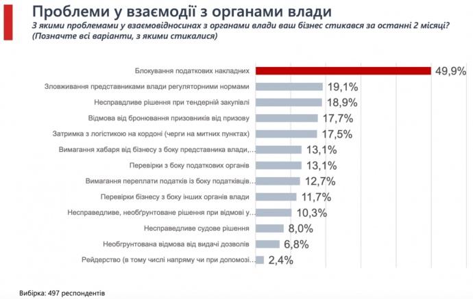 49,9% підприємств зіткнулися з проблемою блокування податкових накладних. Цей показник зріс порівняно з попередньою фазою дослідження в червні (44,1%) і продовжує суттєво переважати інші проблеми.