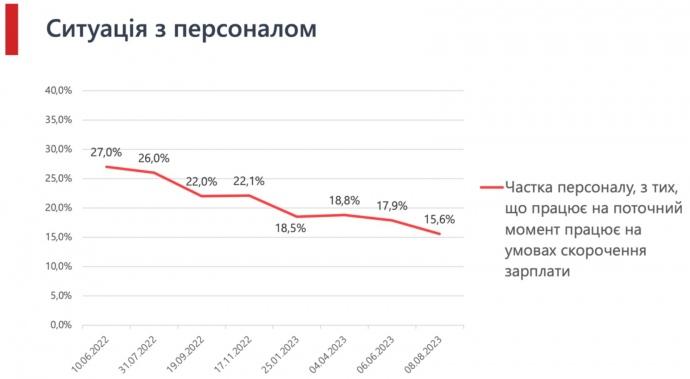 Частка персоналу, який працює на умовах скороченої зарплати, протягом першого півріччя 2023 року зменшується (15,6%).