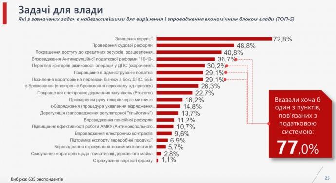 Найбільш пріоритетними завданнями для влади 72,8% підприємців вважають знищення корупції, 48,8% – проведення судової реформи, 40,8% – покращення доступу до кредитів та їх здешевлення, 36,7% – проведення податкової реформи 10-10-10 (+3). Загалом змін у податковій системі хочуть 77% респондентів.